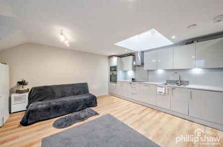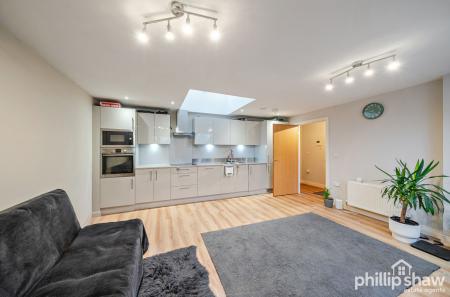 The property features a bright and spacious open-plan living and dining area, complemented by a modern fitted kitchen with integrated appliances, creating a sleek and practical space ideal for both everyday living and entertaining.