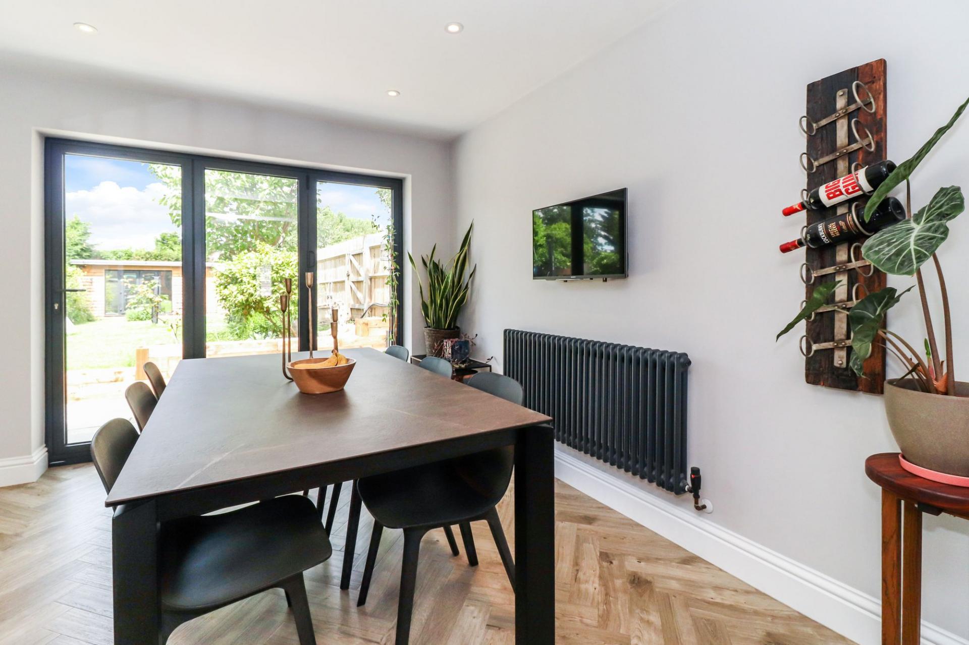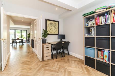 The ground floor is finished to an exceptional standard, featuring elegant parquet flooring throughout. A modern, fully fitted kitchen leads to a bright and spacious dining area that overlooks the rear garden—ideal for entertaining. The comfortable sitting room boasts a charming feature fireplace, while a further reception room offers versatility as a fourth bedroom, home office, or playroom. A useful utility room, downstairs WC, and ample storage complete the ground floor layout.