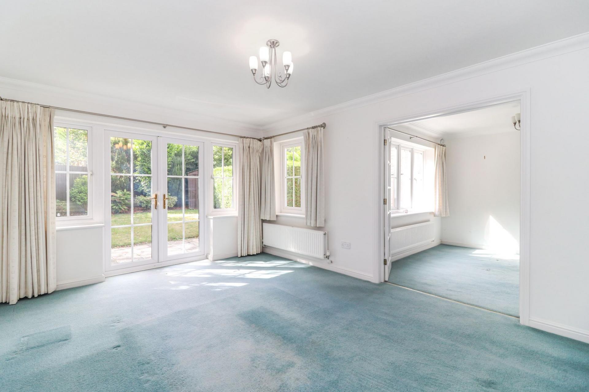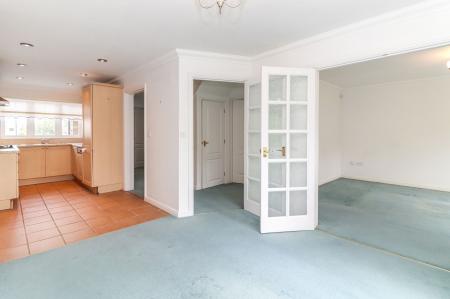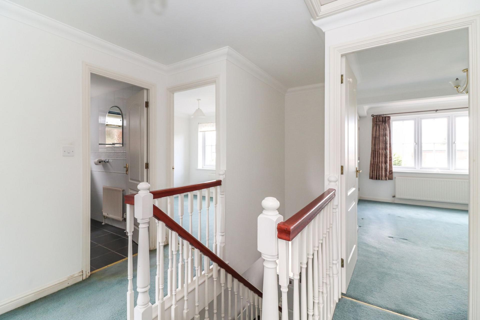 The ground floor features a welcoming entrance hall leading to a generous lounge with French doors opening to the rear garden, creating a bright and airy family space. A separate dining area flows naturally from the lounge, providing ample space for entertaining. The kitchen is fitted with a range of units and work surfaces. The ground floor accommodation is completed with a guest cloakroom, and a convenient utility room, which offers side access to the garden and front of the property. The integral garage is accessible from the hallway.