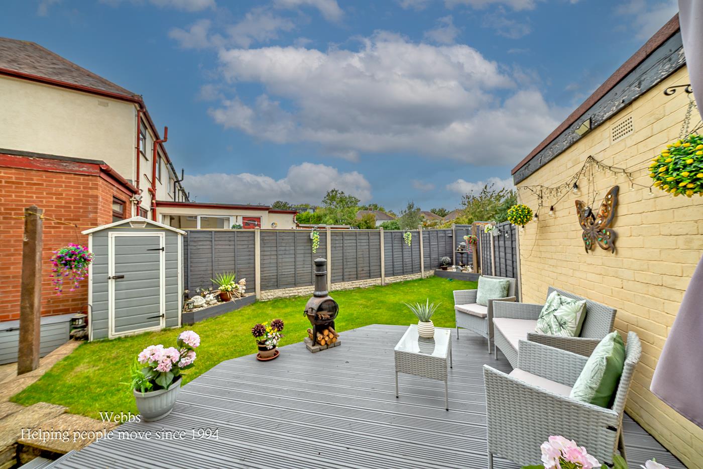 The rear garden is a true oasis, thoughtfully landscaped for low maintenance and enjoyment. It features a combination of paved and lawn areas, an elevated decking space ideal for outdoor dining, and a handy garden shed for storage.