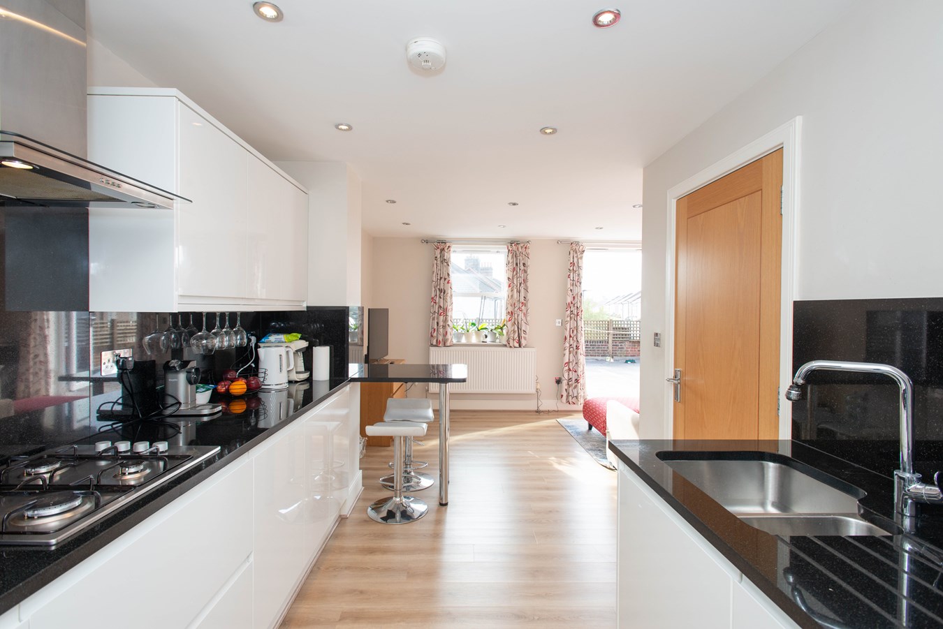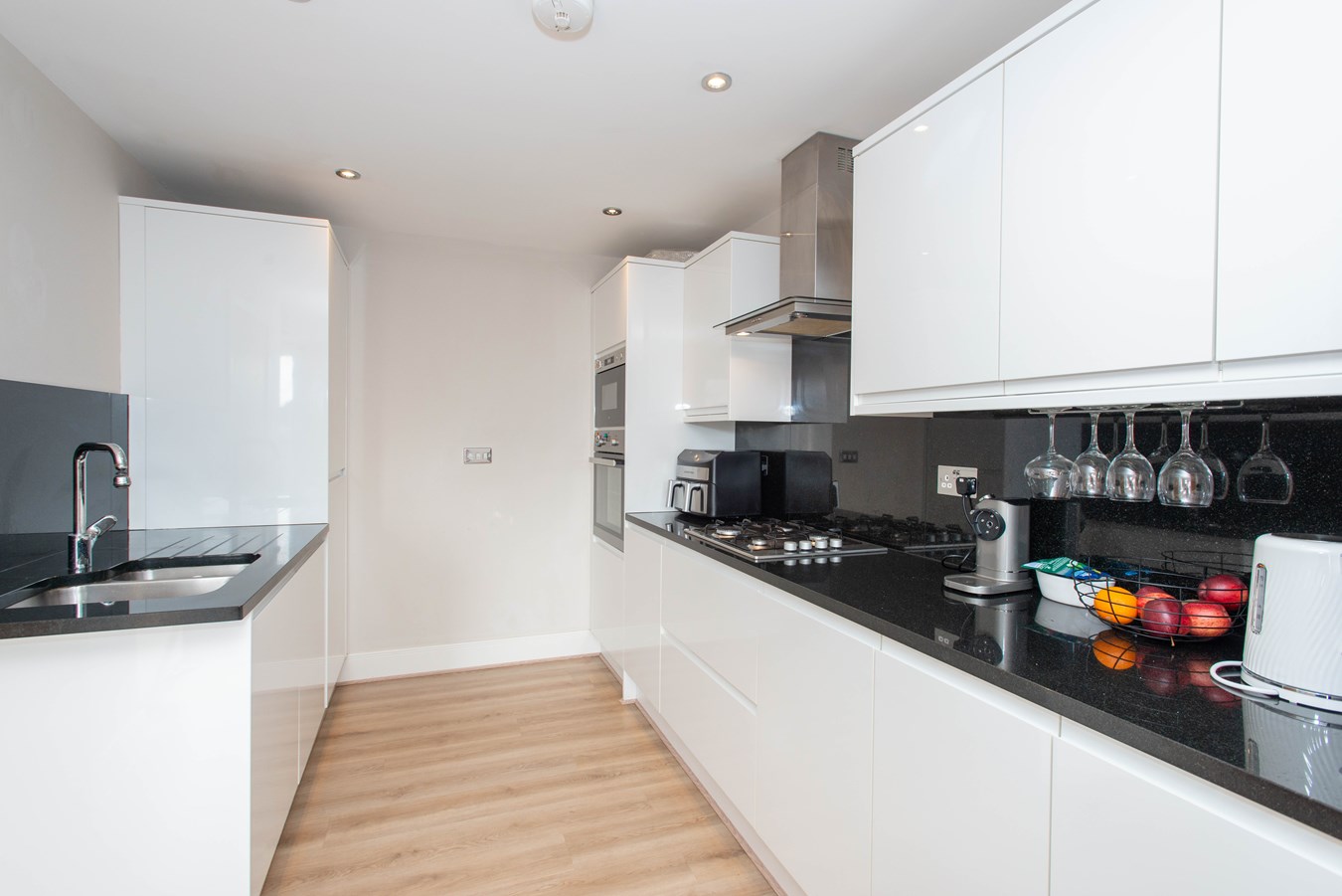 The property features an open plan, contemporary gloss-finish fitted kitchen with granite worktops and splashbacks, equipped with a built-in oven and hob, as well as integrated appliances including a dishwasher, fridge freezer, and washer dryer. Additional benefits include UPVC double-glazed windows and a gas central heating system.