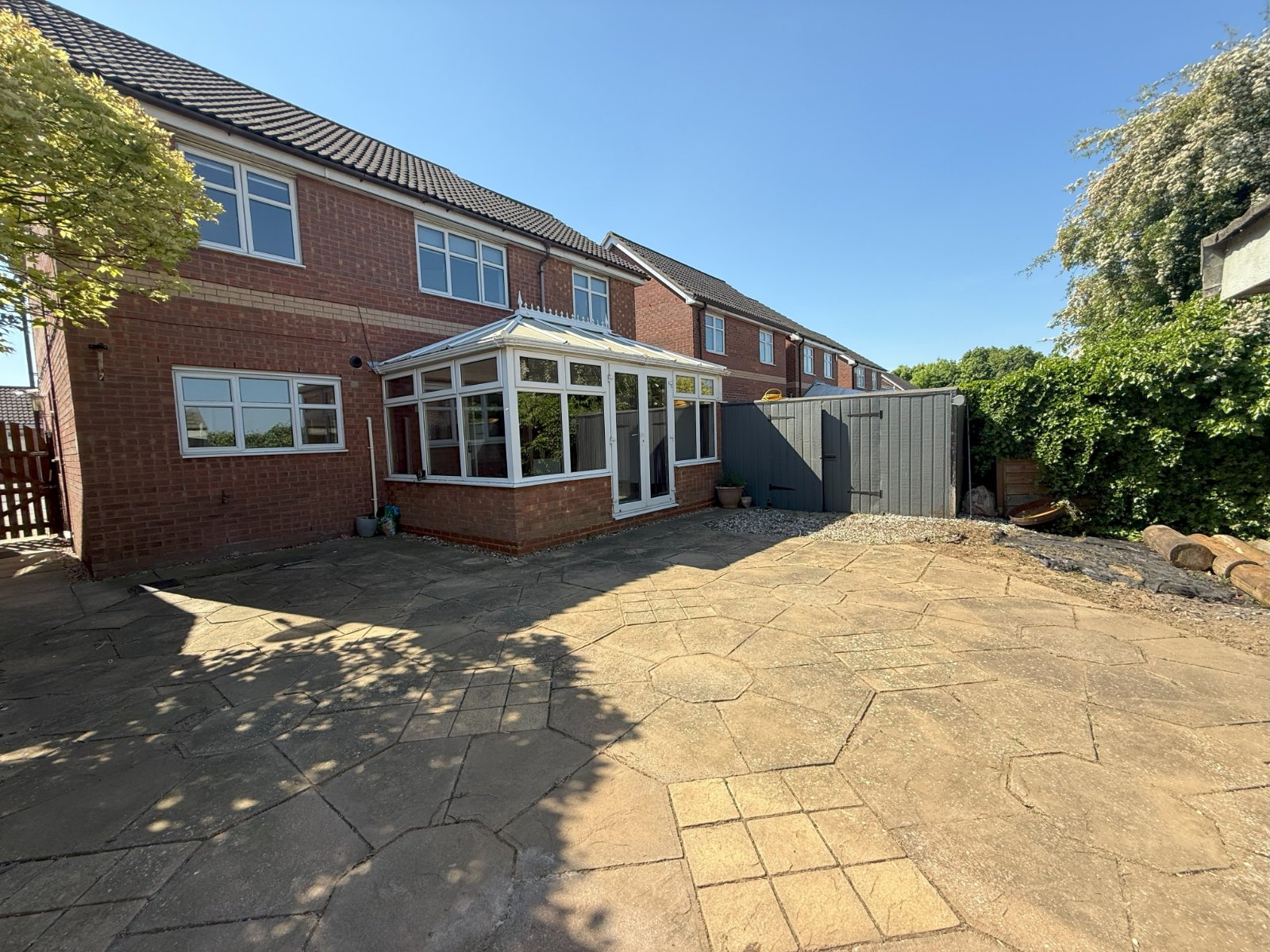 The rear garden is a low maintenance patio garden with two storage sheds.