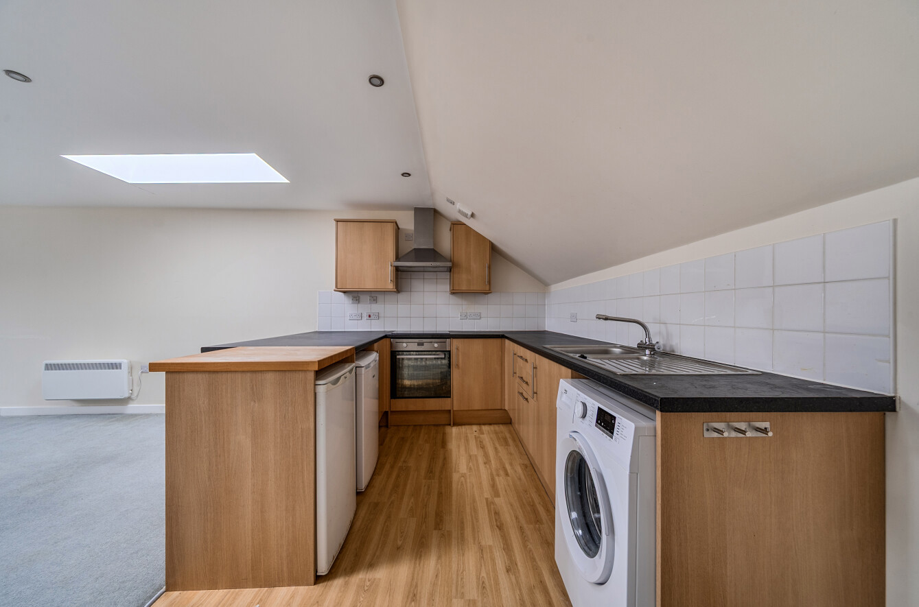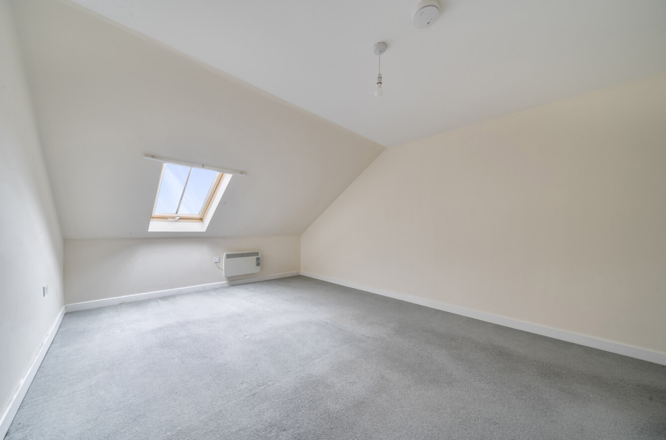 Accessed via a secure communal entrance hall, stairs lead to the upper levels. The apartment itself comprises a generously proportioned open-plan kitchen, dining and living area flooded with natural light, a large double bedroom, and a contemporary bathroom. Additional benefits include double glazing throughout and efficient electric heating.