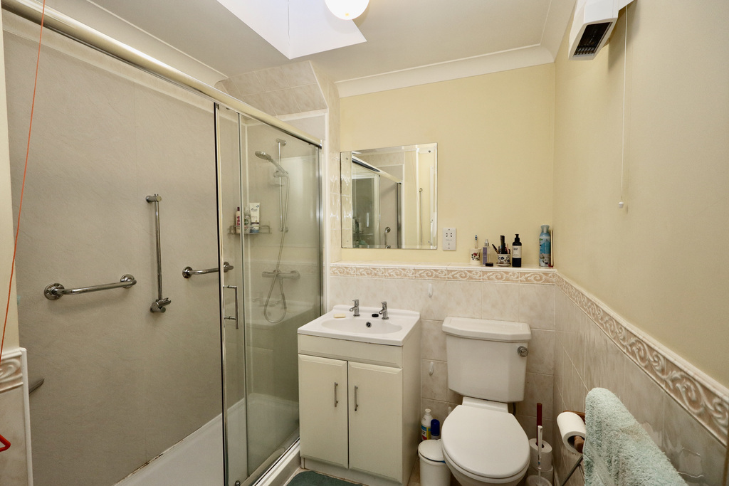 - Spacious shower room with walk-in shower, basin with storage cabinet below, WC, wall-mounted heater, heated towel rail and an opening overhead skylight for natural light and ventilation.
