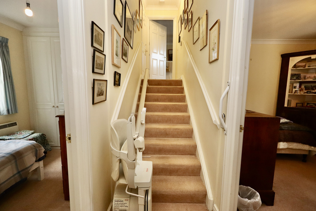 - The upper level is accessed by a short straight flight of shallow stairs c/w Stannah stair lift: