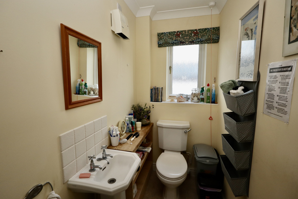 - A guest cloakroom with WC and wash basin at the top of the stairs means there’s a loo on both levels!