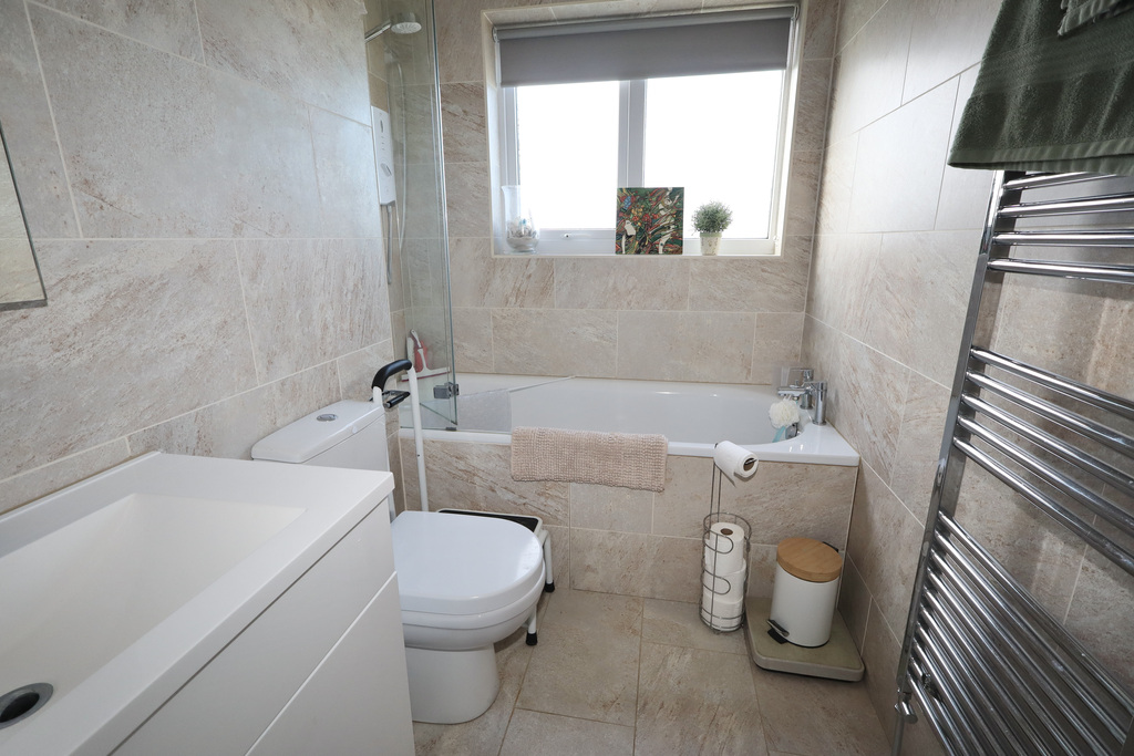 - Well presented bathroom comprising bath with shower over, toilet and wash handbasin