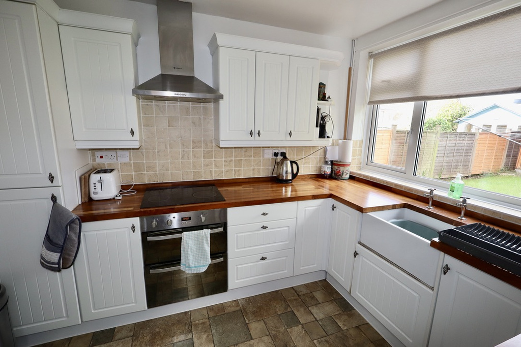 - Neat kitchen with wooden worktop, Belfast sink and integrated oven. Space for a washing machine and a fridge freezer.