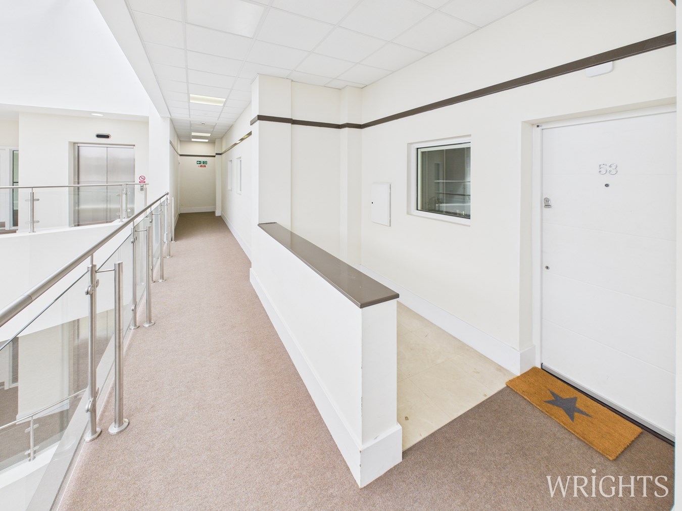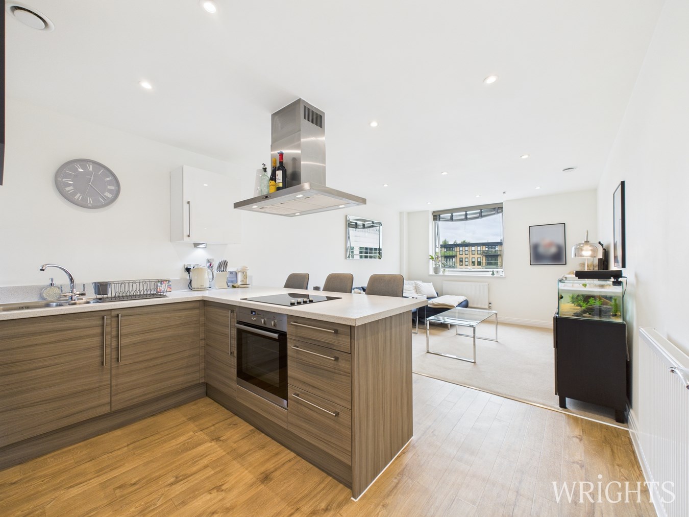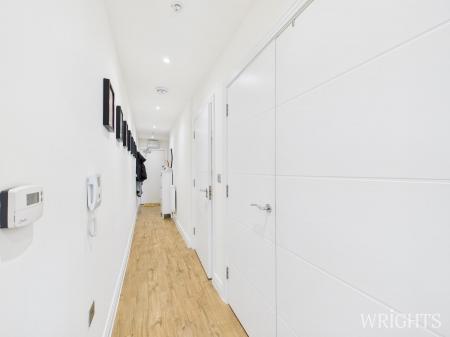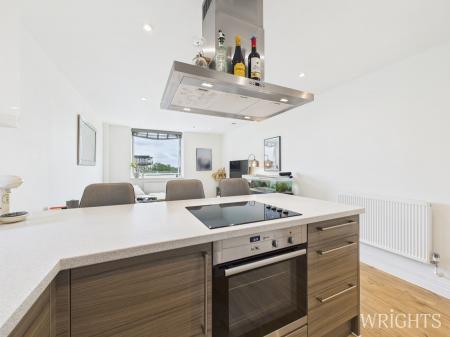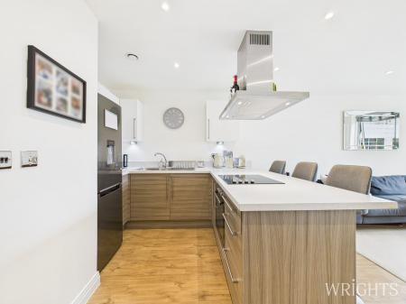 This is the most sophisticated bright and airy apartment offering stylish living. Enter Empire House into the grand entrance with a winding staircase and lifts to all floors. Once on the landing, you can see the impressive atrium below, bathed in natural light. This plot is one of the larger of this style. Enter into the apartment and you are greeted with a long entrance hall with quality floor coverings. Storage cupboard housing the Heatrae Sadia Electromax combi boiler and the Vent-Axia ventilation system. The lounge and kitchen are an open plan design, making this a very sociable space, a large window offers natural daylight. The kitchen has fitted cabinets with integrated washer dryer, oven, hob and extractor hood. There is also a breakfast bar for added convenience. The quality floor covering continues into the kitchen and in the lounge there is fully fitted carpet.
