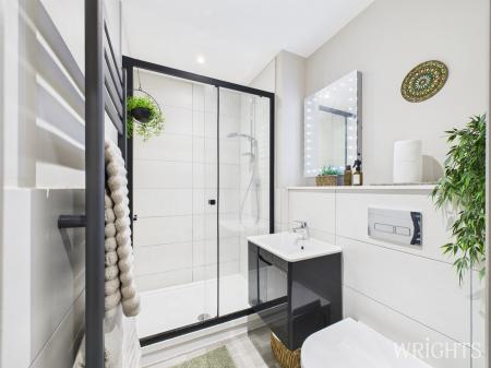 Proceeding down the hallway, you'll find a spacious storage area followed by the principal bedroom at the rear of the apartment, offering privacy and ample spaceeasily accommodating a king-sized bed if desired. The bedroom features tall ceilings and double-glazed windows that overlook the back of the private development. An elegant en-suite bathroom adjoins the principal bedroom, boasting a luxurious finish with beautifully tiled walls, a walk-in rainfall shower, a low level W/C, and a vanity sink. Additional features include a heated towel rail and a heated back lit mirror, enhancing comfort and convenience. At the end of the hallway, you will find the generously sized family bathroom, equipped with a bath and overhead shower, complemented by lime wash paint above the bath, tilted surrounds, and high-end fixtures such as a heated towel rail, low-level W/C, and a heated light-up mirror.