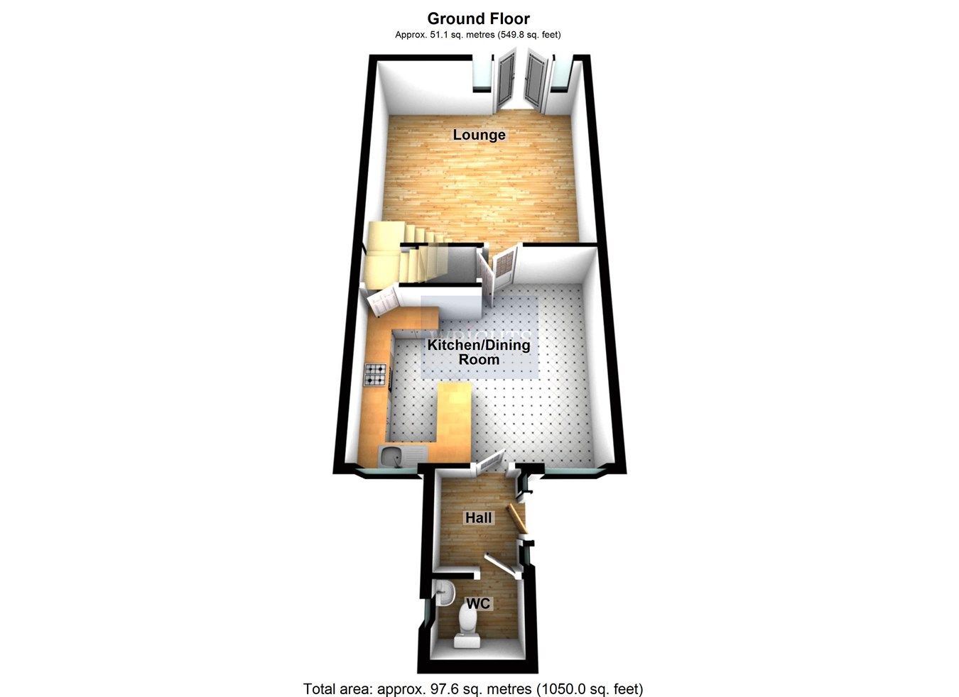 4.90m x 5.00m (16' 1" x 16' 5") Large French doors overlooking the garden, staircase to 1st floor.