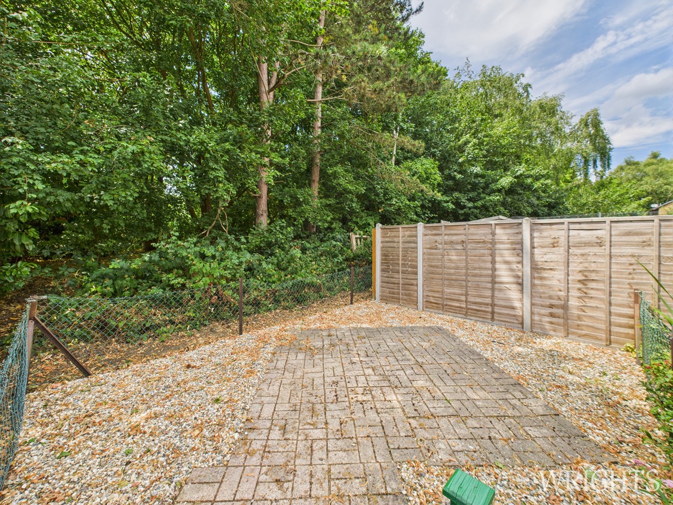 A private garden which is accessed via a side gate. The garden is enclosed and there is a wooded area beyond.