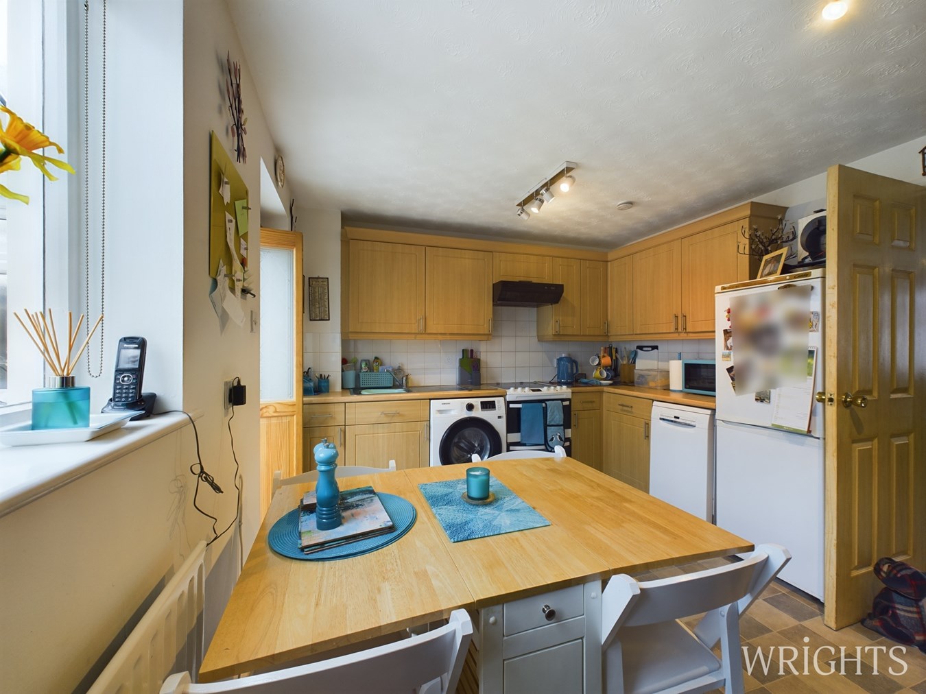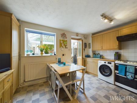 A superb range of shaker style wall and base units. Space for a table and chairs, views into the conservatory.