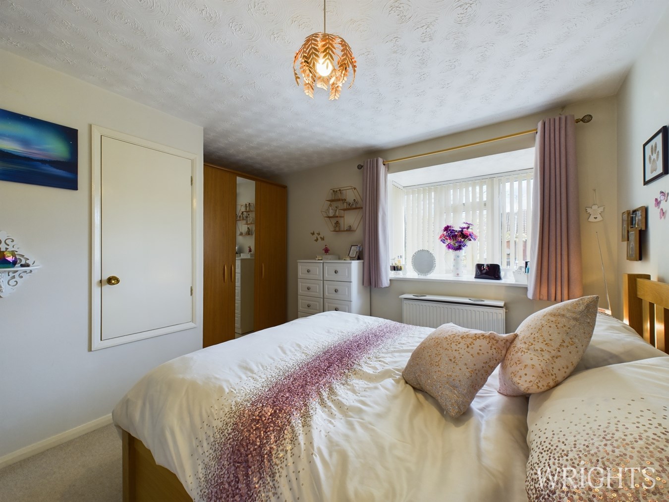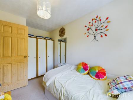 A spacious principal bedroom which features Fitted wardrobes, bonus storage cupboard and bay window to the front elevation.