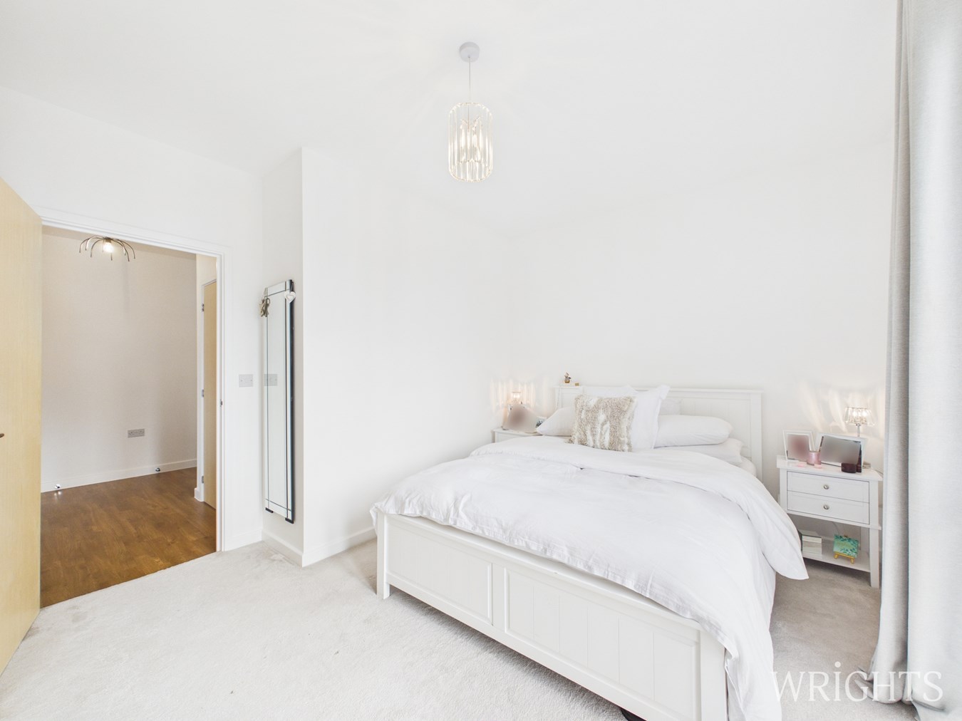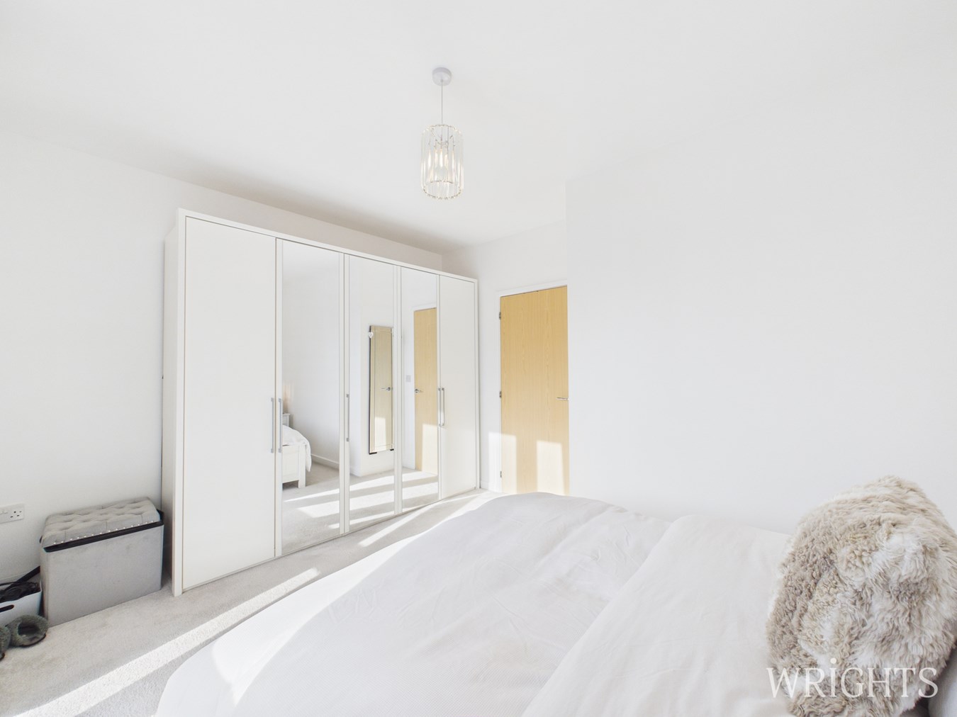 The room features two double-glazed windows with made to measure blinds that provide a bright view. This room features cosy carpets and has ceiling lighting, along with a double wall-mounted radiator. The large wardrobes in the room will remain, offering ample storage space.