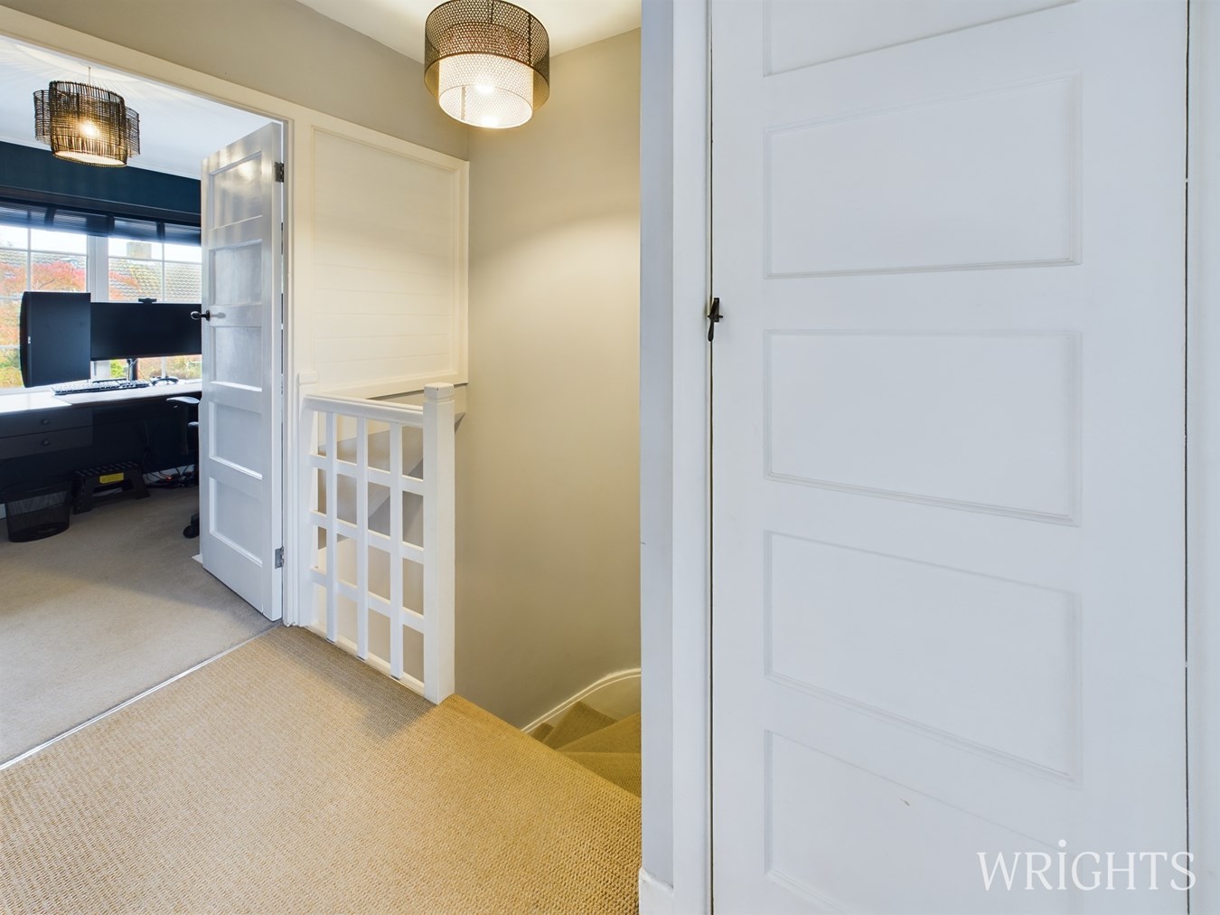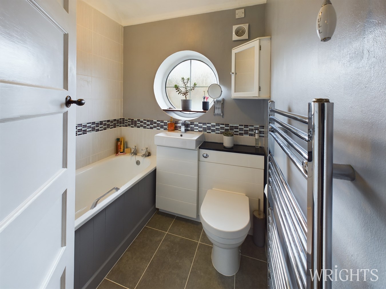 The spacious landing offers easy access to each thoughtfully designed room, featuring convenient loft access for extra storage options and the airing cupboard. The principal bedroom has been thoughtfully styled to create a calming sanctuary, providing a peaceful retreat for unwinding at the end of the day. This room features the classic porthole style window and Bedroom two is generously proportioned, boasting a large alcove that is ideal for fitted wardrobes, enabling you to maximize space while keeping your belongings organized. This room overlooks the serene rear aspect, granting a tranquil view and an added sense of privacy. The third bedroom is perfectly suited for a child's room, providing a cozy and imaginative space. A handy storage cupboard ensures that you have plenty of room to keep everyday items organized and easily accessible. The bathroom has been tastefully renovated to achieve the ideal blend of modern elegance and classic charm. Featuring conveniences such as a shower over the bath and a heated towel rail, this space is designed for both practicality and relaxation. Additional storage solutions enhance this well-appointed area, making it as functional as it is stylish.