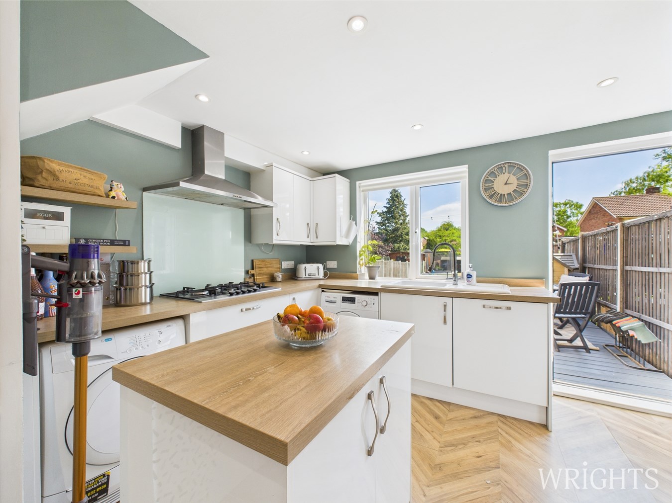 Nestled in the heart of this sought-after residential area, this property boasts a generous driveway that provides parking for two cars. As you enter the residence, you'll find a welcoming lobby that flows seamlessly into the inviting living room, highlighted by large front-facing window that fills the space with natural light and to the rear BIFOLD doors opening out onto the expansive garden. The kitchen, located also to the rear, features integrated oven and microwave, including space for a dishwasher and washing machine. Ensuring convenience for everyday living a door from the kitchen leads directly to the rear patio, perfect for outdoor enjoyment. Lovey wooden surfaces with a centre island for food preparation. Gas hob with extractor fan. White glossy finish to the kitchen units . Plenty of space for the family to enjoy their meals. Stairs leading upstairs provide a secret storage area. Youll discover three generously sized bedrooms on the first floor with every bedroom boasting plantation shutters . The family bathroom is also conveniently located on this floor with a separate toilet all very tastefully done and fully tiled. A lovely family home to make it your own.
