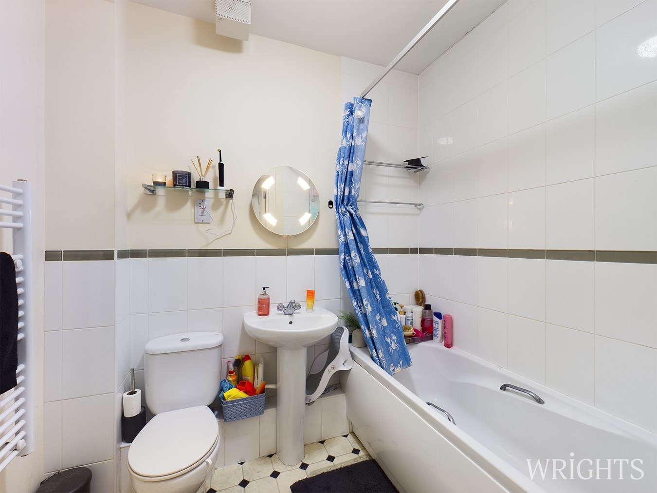 Panel bath with shower over, pedestal sink, low level WC, part tiled walls, extractor fan and heated towel rail.