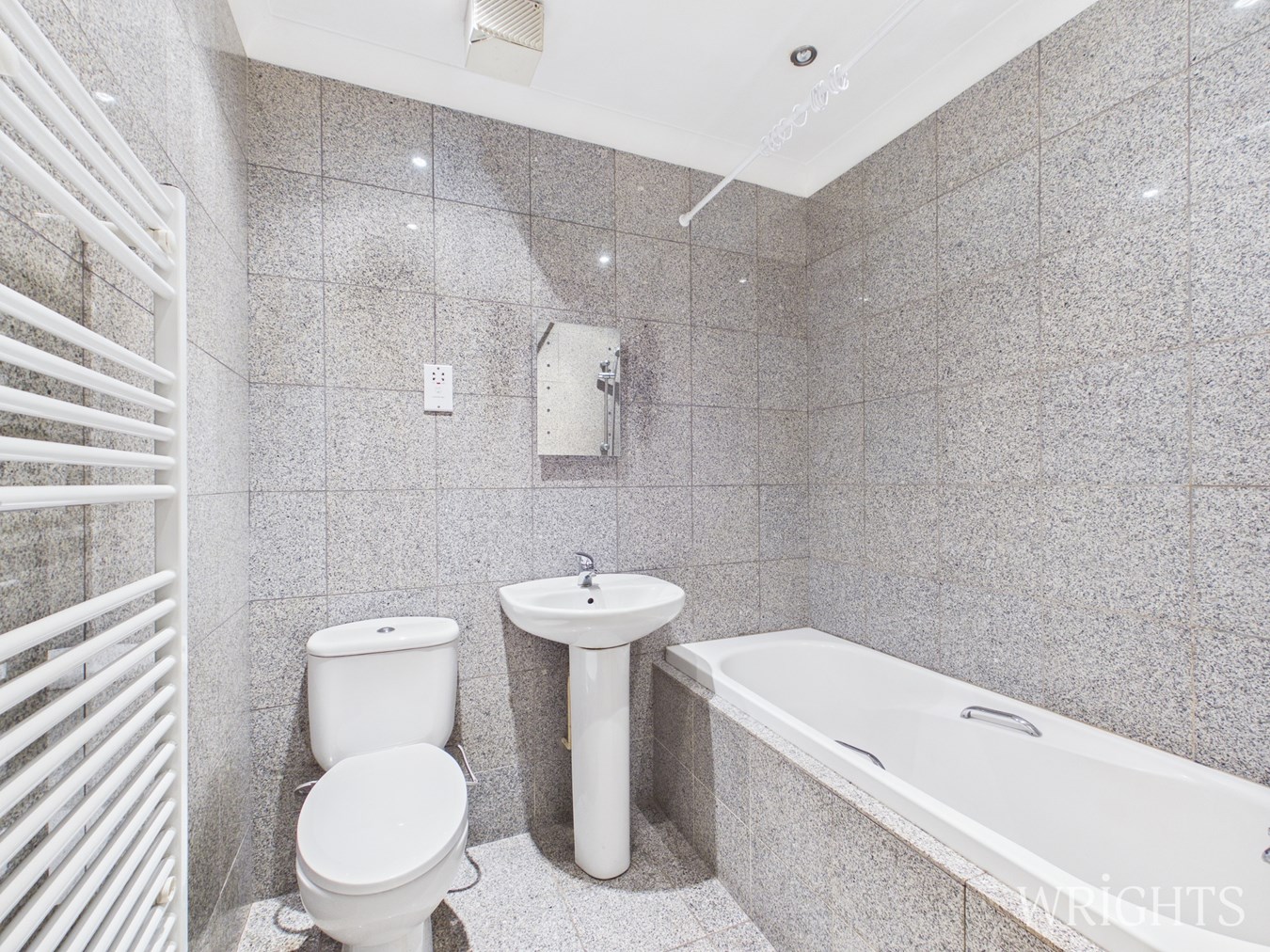 A fully tiled, stylish bathroom with a shower over the bath, a hand basin, toilet, and heated towel rail.