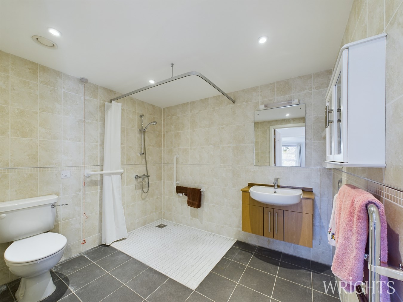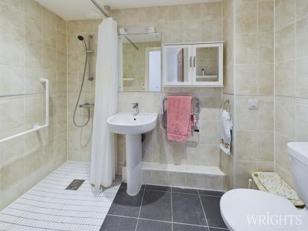 A spacious room with three piece suite comprising a dedicated shower area with wet room style floor. Tiled floors and walls, sink with and w/c. There are grab handles for comfort.