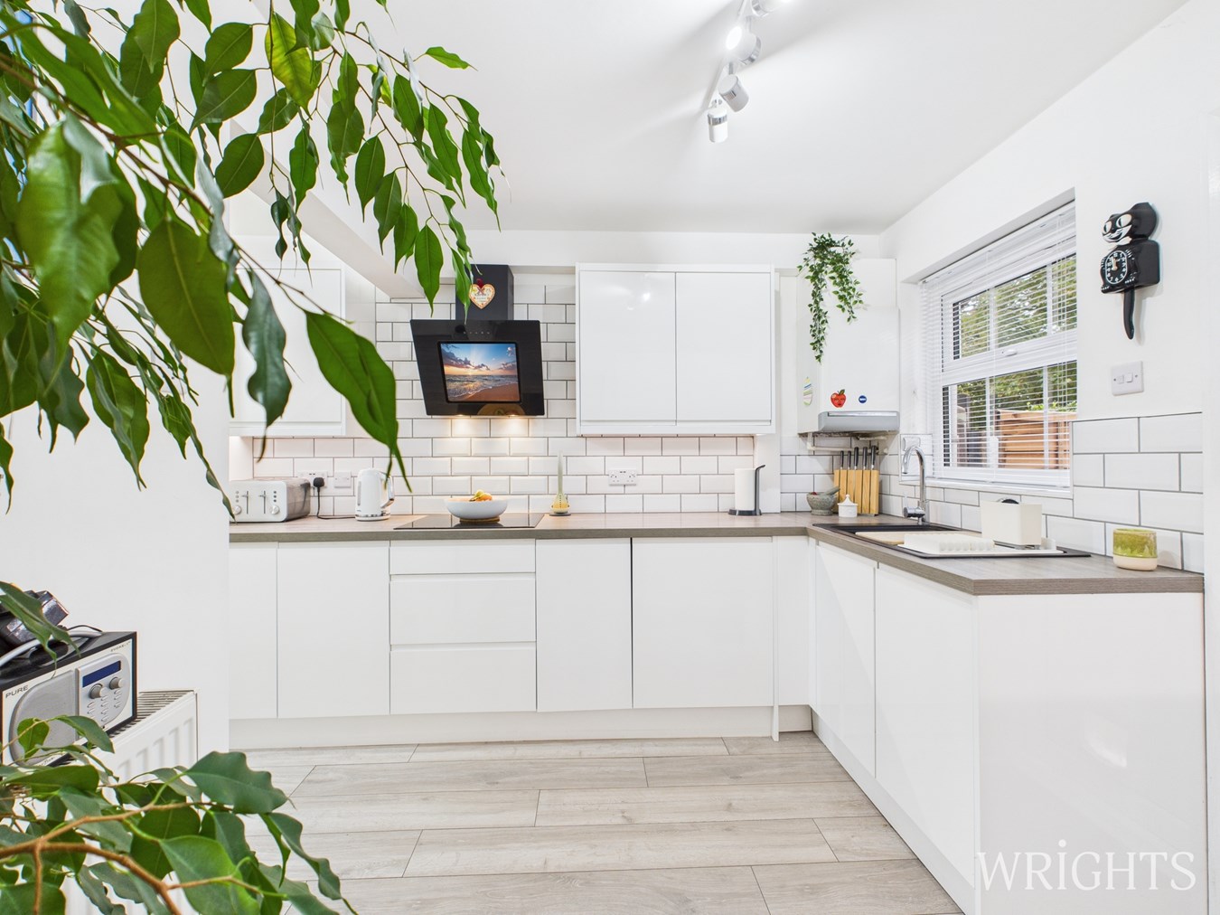 The entrance hall welcomes you into the property, leading seamlessly into a modern, well-appointed kitchen featuring high-gloss, handle less units and integrated appliances. The NEWLY RENOVATED kitchen provides convenient rear access directly to the beautifully landscaped, sunny garden. Adjacent to the kitchen, there is a spacious living room diner decorated with elegant plantation blinds on the windows, creating a cosy yet stylish environment for relaxation and entertaining. From the living area, a set of glass doors opens into a lovely conservatory that offers delightful views of the garden, providing an versatile space for leisure or hosting guests.