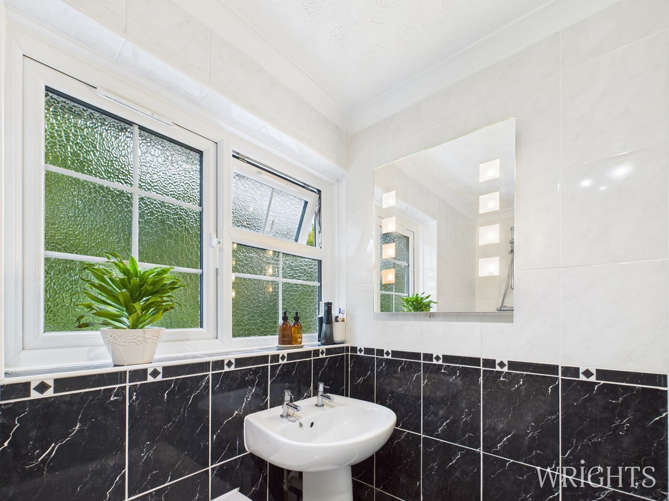 The family bathroom is conveniently equipped with a modern two-piece suiteincluding a bathtub with a shower over itand features a chrome bath radiator. Large windows allow plenty of natural light to fill the space, creating a bright and airy atmosphere. Additional touches such as vanity mirrors with integrated lights enhance the bathrooms functionality and style.