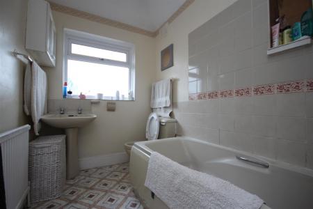 Bathroom - Side panel bath, low flush WC, pedestal wash hand basin, window to rear, radiator.