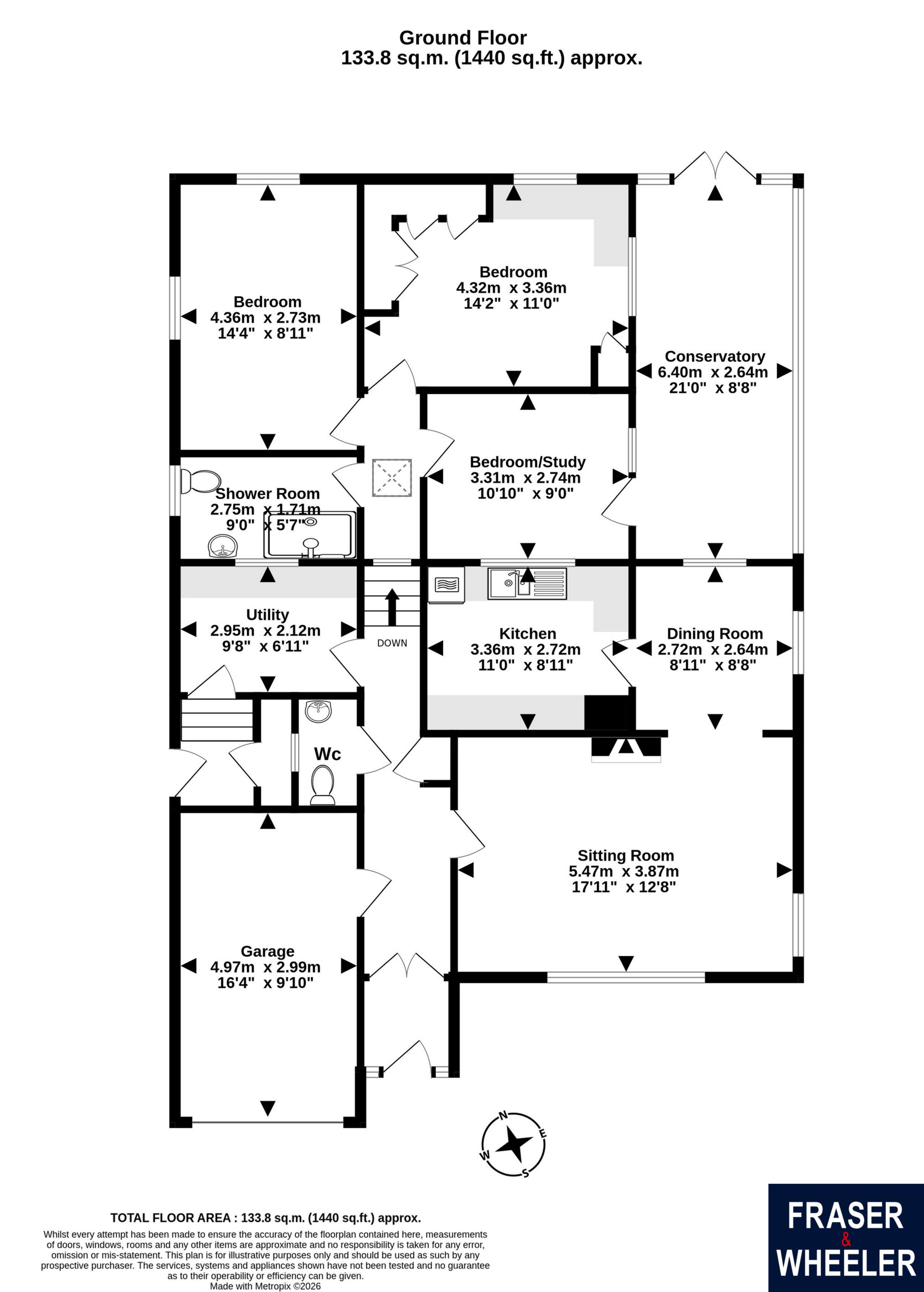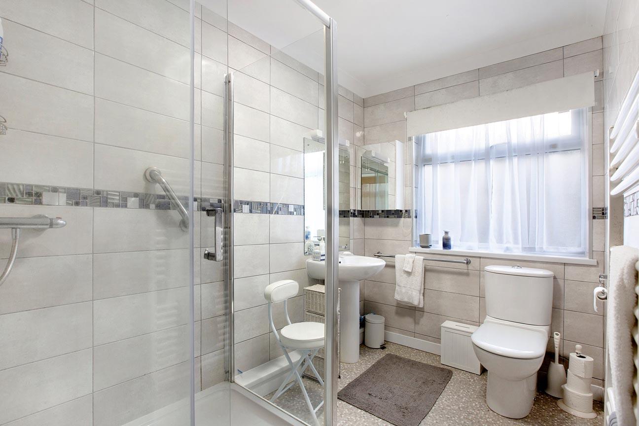On the lower ground floor are three double bedrooms with the main bedroom fitted with a range of bedroom furniture and the two larger bedrooms both having a lovely outlook over the garden. The third bedroom has been used as an office and has a doorway leading to the spacious conservatory. This excellent addition offers a lovely place to relax and enjoy the setting and open outlook over the garden and the town. The bathroom has been updated and is finished with fully tiled walls and includes a walk-in shower enclosure with mains powered shower.