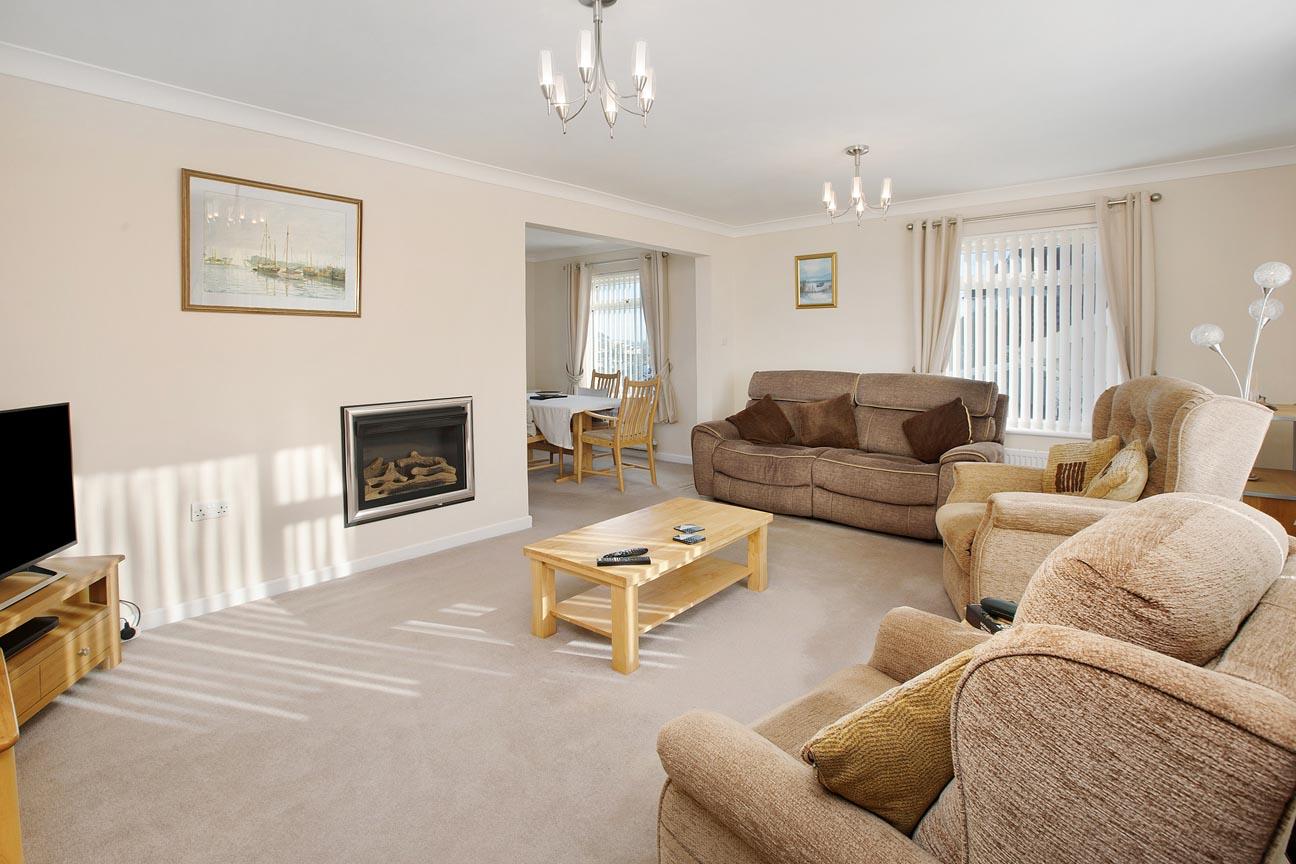 The bright, double aspect living room enjoys a lovely open outlook to the side and a picture window looks onto the front garden. An electric flame affect fire provides a focal point and an archway leads through to the double aspect dining room, which also enjoys a lovely open outlook including some sea glimpses. A door leads through to the kitchen which has been well designed to maximise the space and includes an electric double oven, gas hob and integrated dishwasher and is finished with granite worktops. It also enjoys a lovely open outlook. Across the hall from the kitchen is the spacious utility room which is fitted with matching units with space and plumbing for a washing machine and tumble dryer. There is access to a lobby with a useful storage area and a door to the side of the property.