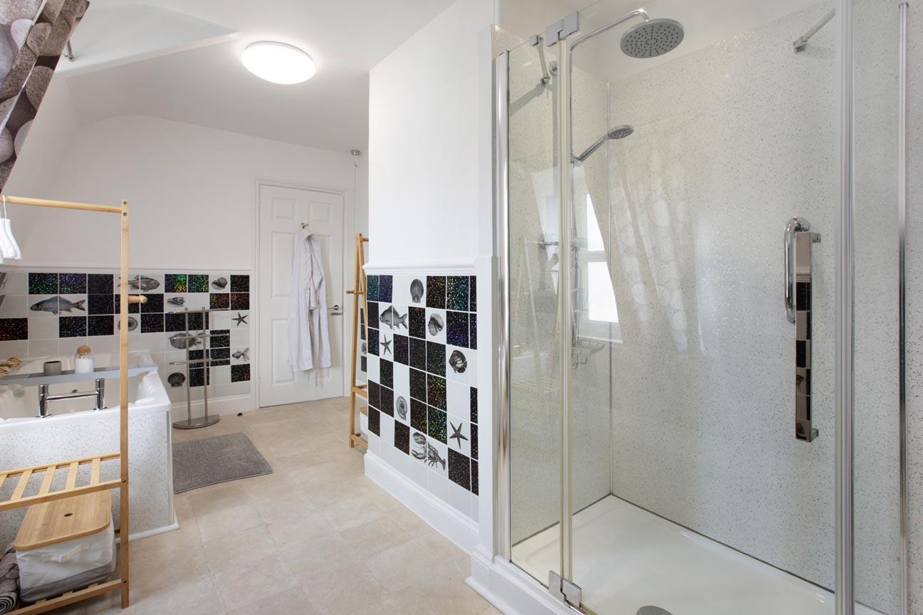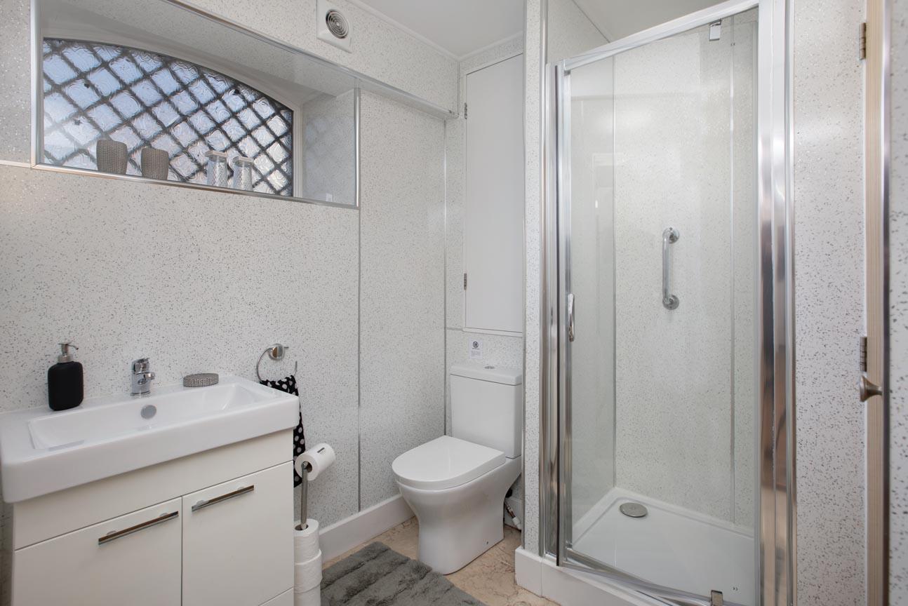 SHOWER ROOM: Double-width cubicle with shower unit. Dual-flush close-coupled WC. Wash basin with stoarge below. Airing cupboard with radiator. Heated towel rail. Obscure window.