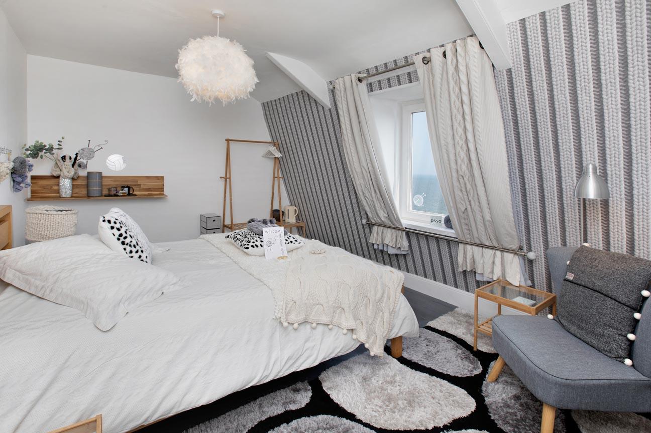 GUEST BEDROOM SUITE: Two windows to rear with panoramic sea views. Two double radiators. Picture rail. Coved ceiling.