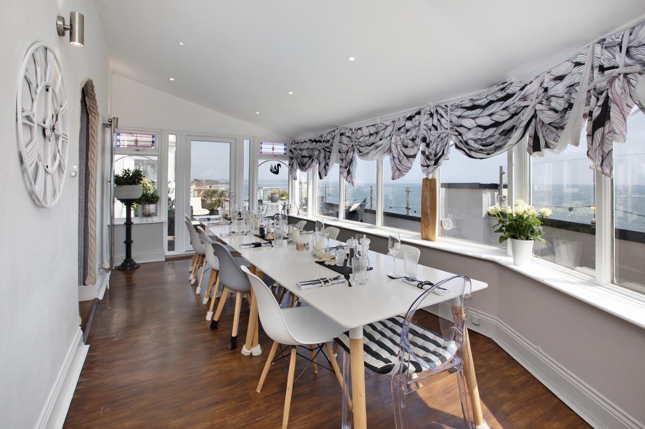 DINING ROOM: Being L shaped this particularly spacious room enjoys wonderful far reaching sea and coastal views. uPVC double glazed windows, twin French doors opening onto the rear terrace and flagged side terrace. Two double radiators. Wall lights.