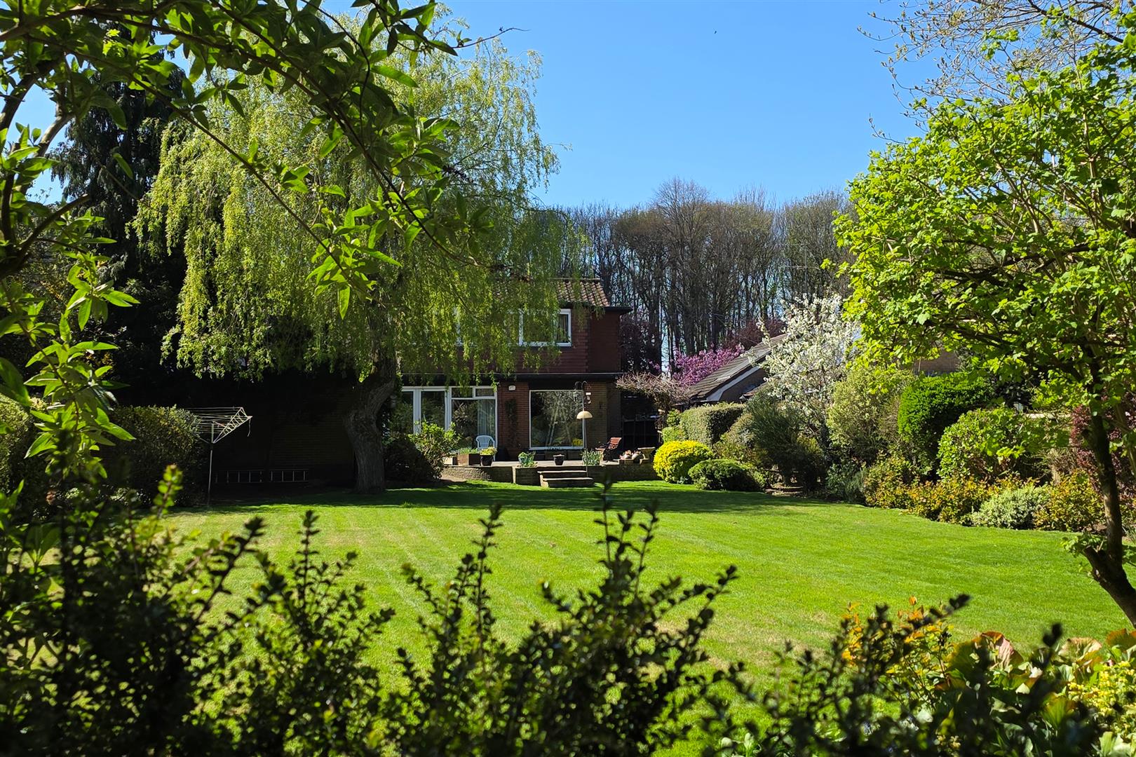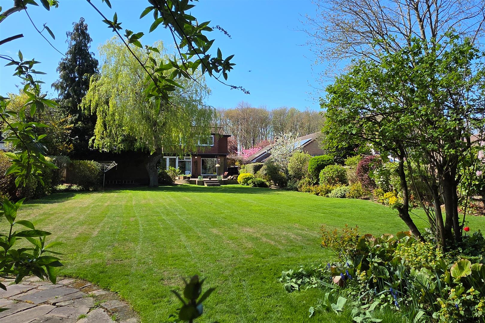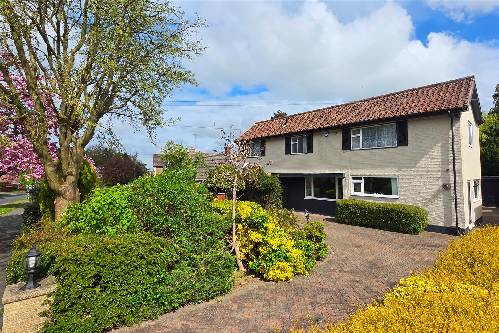 Outside - The property has a wide frontage to Elveley Drive and a double access crescent driveway has a central lawn and shrubbery. The driveway provides excellent parking and leads past the house to the detached double garage. The rear garden is a delight. A lawn is framed by an array of well stocked shrub borders with colour and many areas of interest. An extensive patio lies directly to the rear of the house.