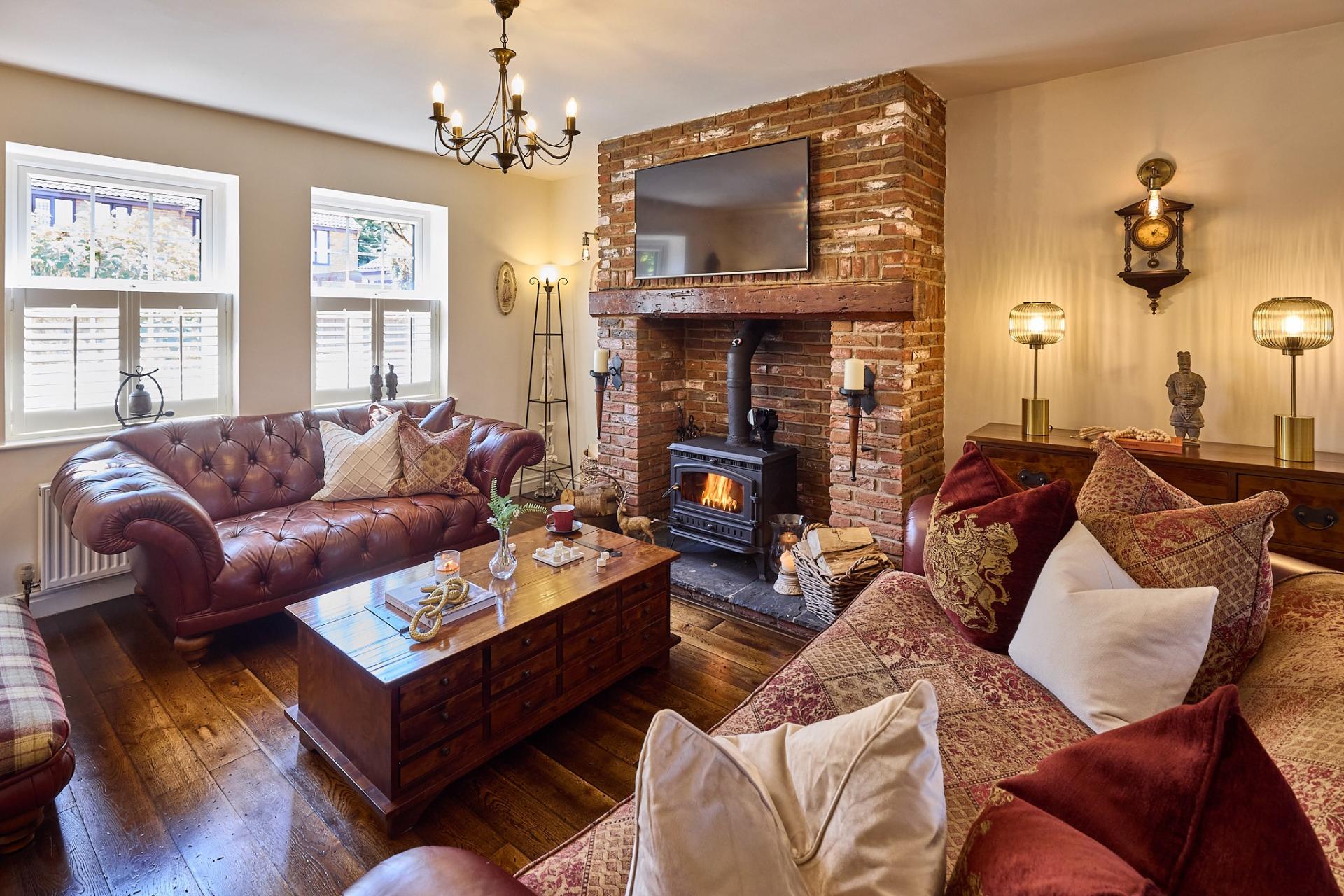 - Charming Lounge with Exposed Brick Fireplace and Log Burner