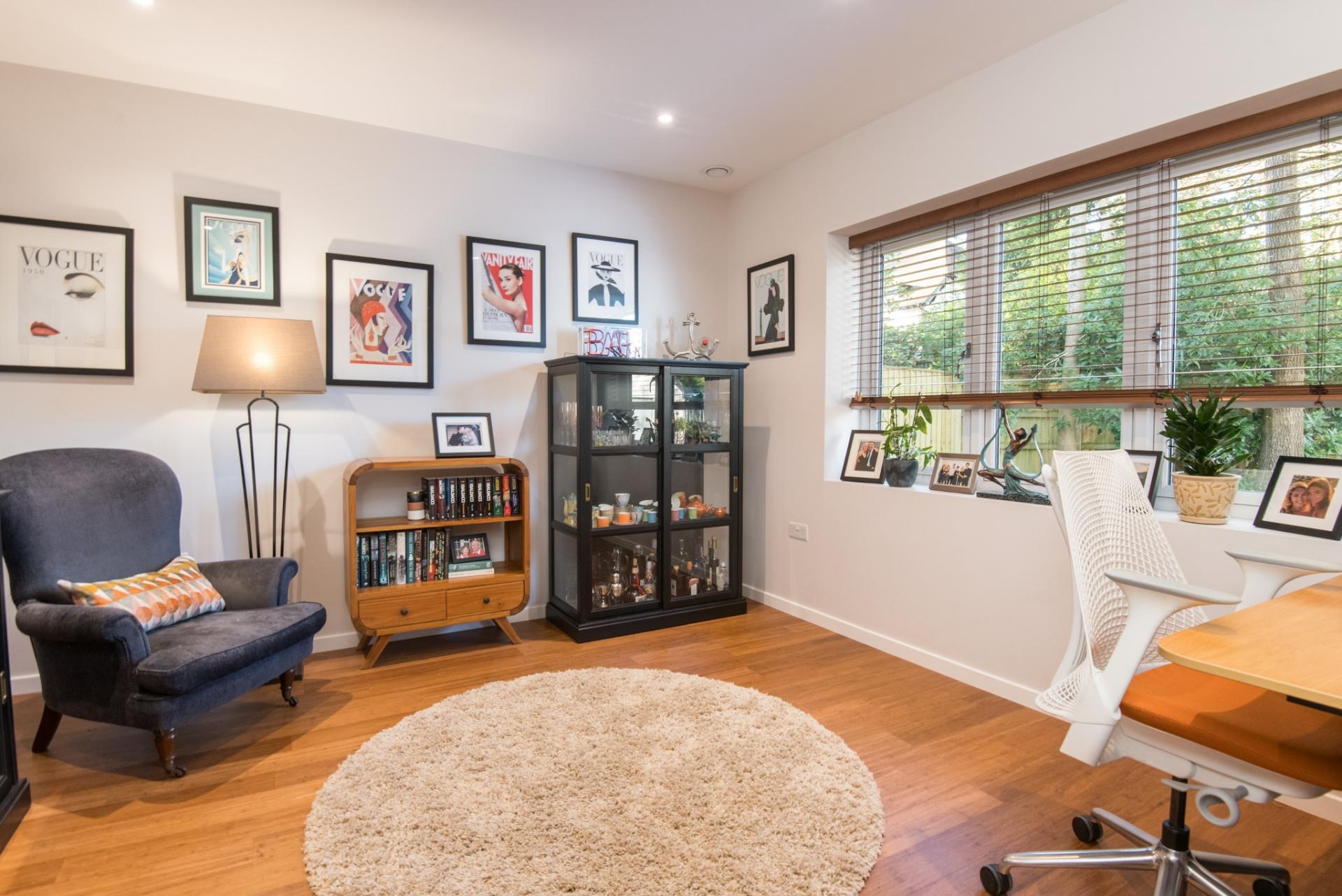 - Living Room with feature fireplace, bespoke built-in shelving & cupboard units