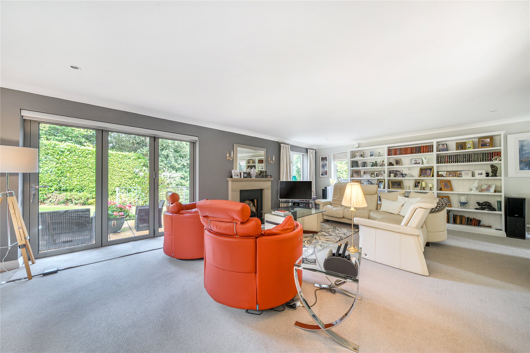 Bespoke glass doors connect this room to a 25ft, triple aspect sitting room with modern feature fireplace and additional bi-fold doors leading to a private patio terrace.