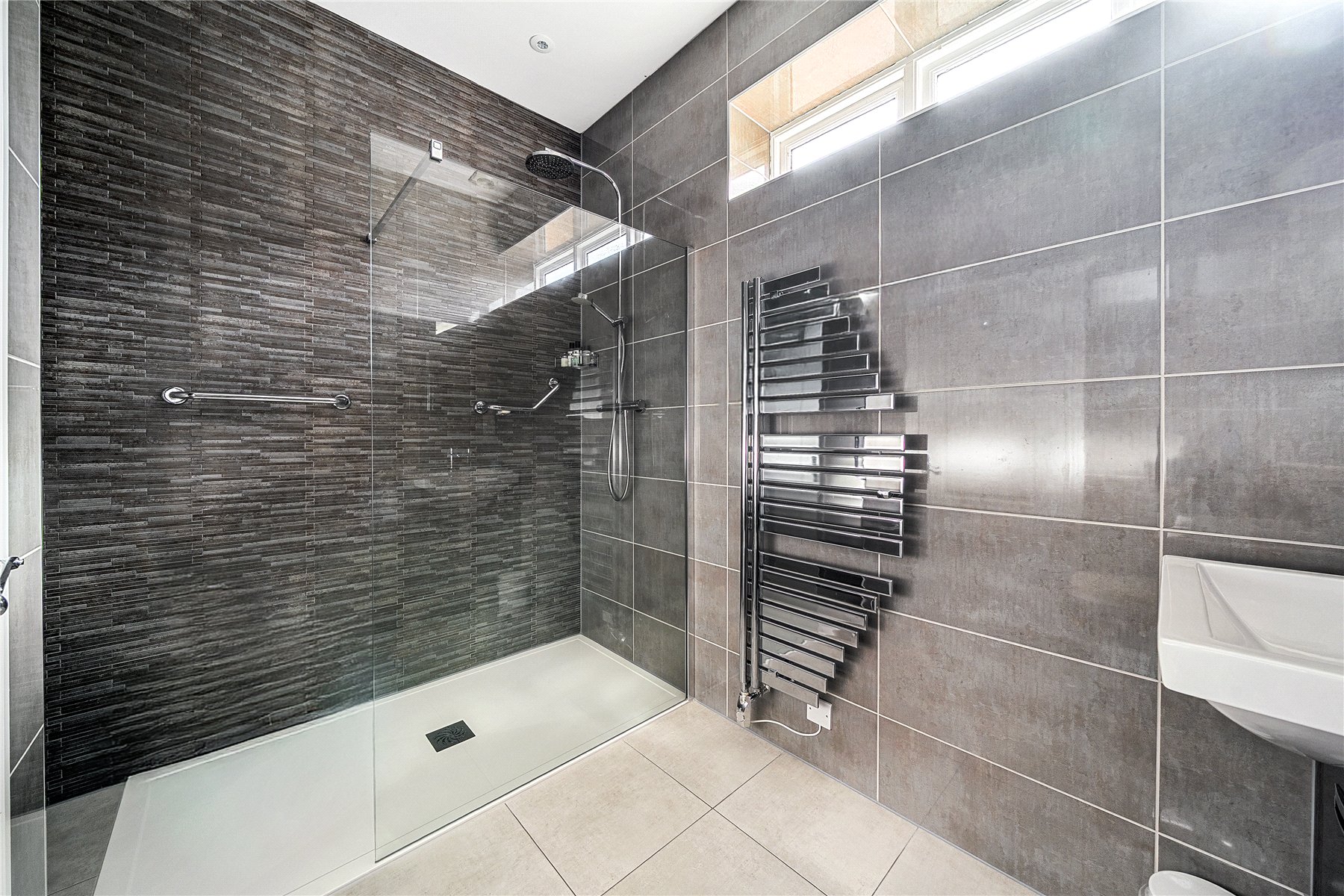 From the landing, a half flight of stairs leads to a stylish double bedroom with fitted wardrobes, served by a luxuriously appointed ensuite with a walk-in shower, rainfall showerhead and underfloor heating. There is further storage on the landing.