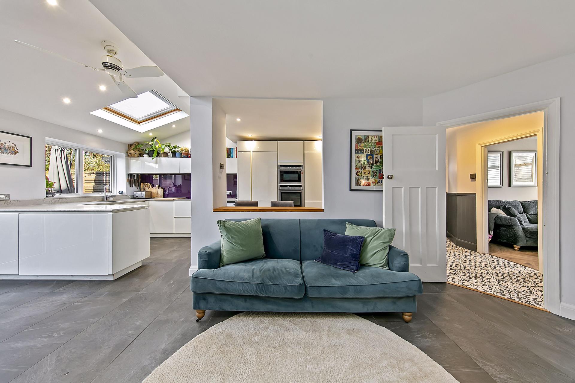 The back of the house gives way to a well designed kitchen/dining/family room with a partial wall opening allowing for good visual space as well as distribution of natural light. The kitchen with breakfast bar overlooks the sitting room, and then flows into the dining area with twin roof lights and tri-fold doors opening out to the garden. The dining area opens to the main sitting room complete with bespoke joinery / shelving unit with inbuilt display lights.