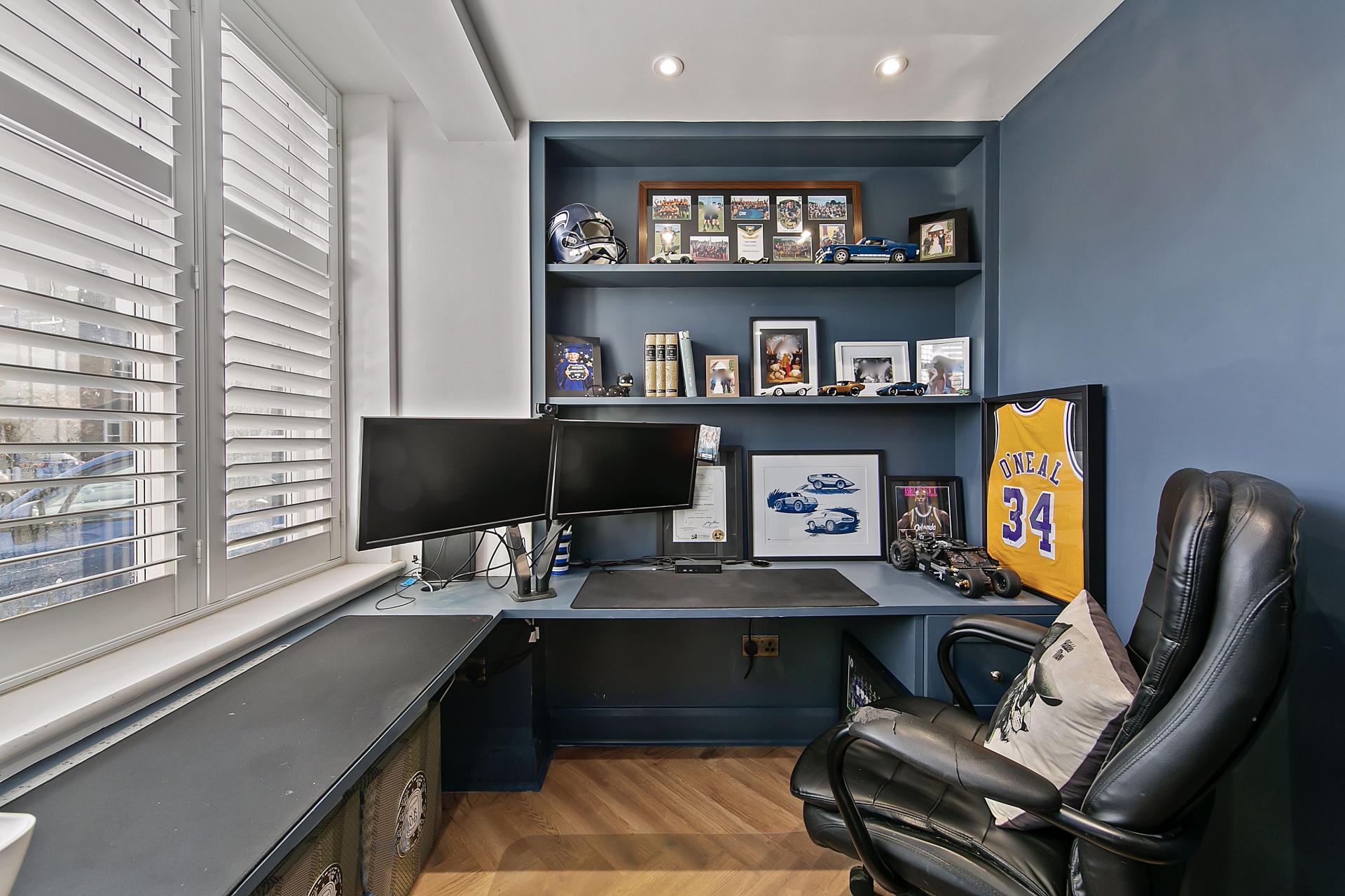 It is a breath of fresh air to comes across layout that stands out from the crowd with a comfortable internal floor area extending to 1130 sqft. (105 sqm). From a side entrance and front door, a welcoming entrance hall awaits with timber wall panelling and decorative flooring. At the end of the hall is a highly practical laundry / boot room with space for washing machine and separate dryer, worktop/sink, storage and W/C. Immediately off the left is a front aspect snug / TV room with a bay window including fitted shutters, and a clever pocket-door leads through to home to the office, with built-in desk and shelving.