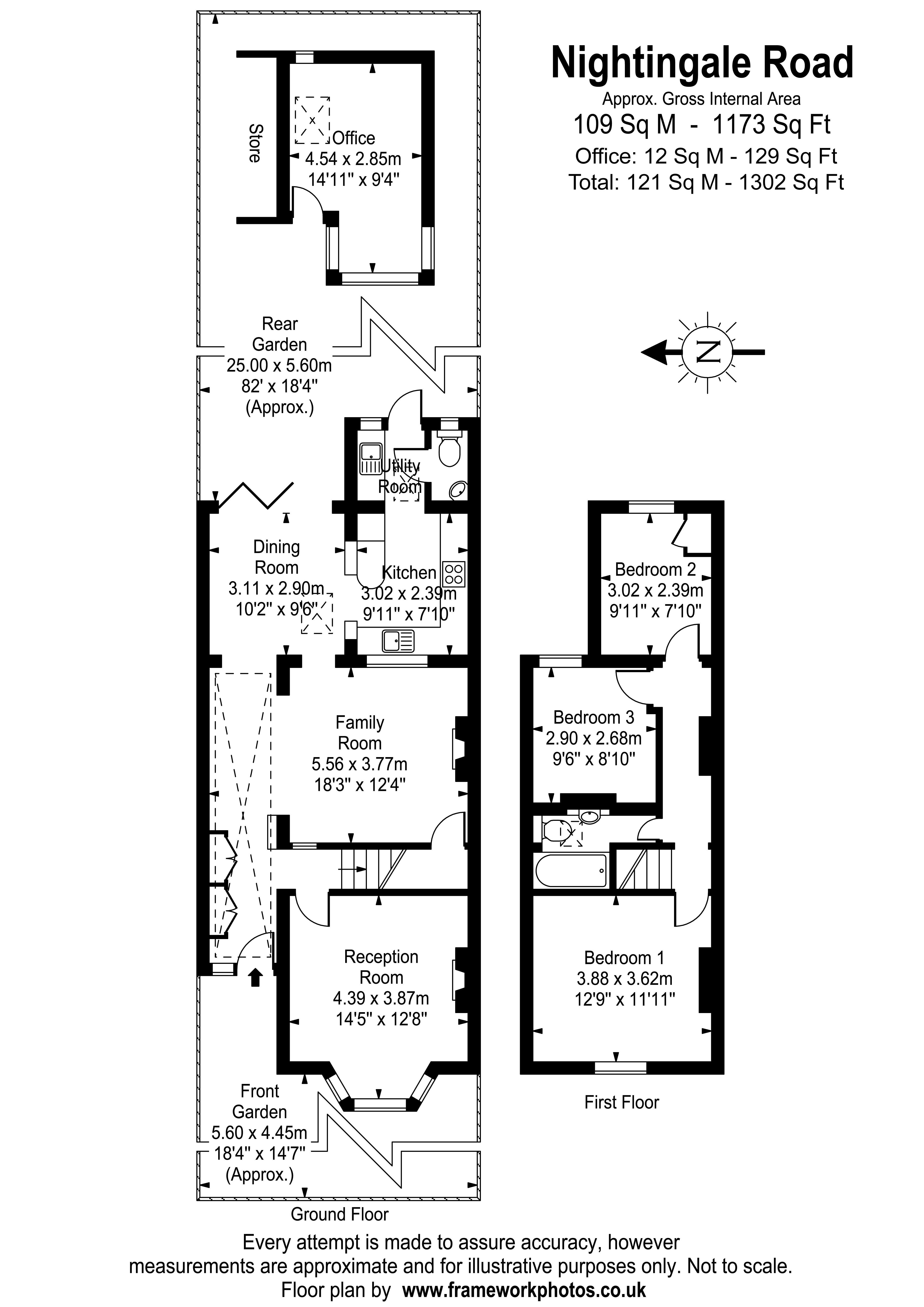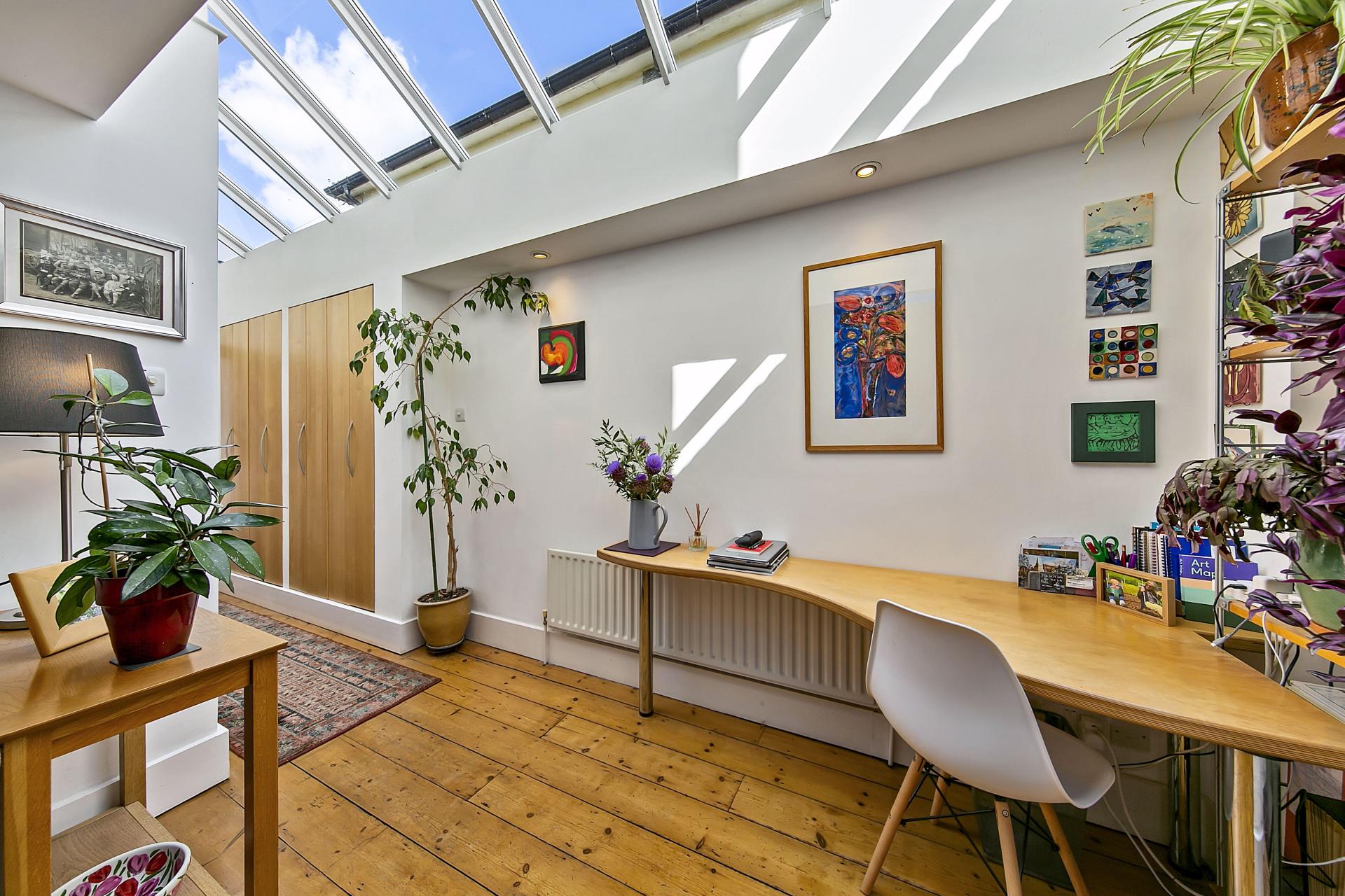 Upstairs provides a lovely front aspect main bedroom, landing with loft access leading down to two further bedrooms – one double, and a further rear bedroom currently set up as a home office. To complete this floor is a stylish bathroom with tunnel skylight window.