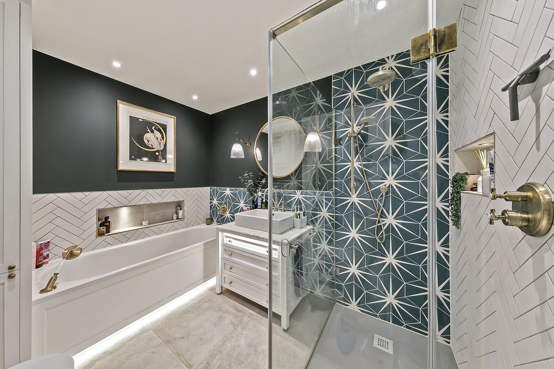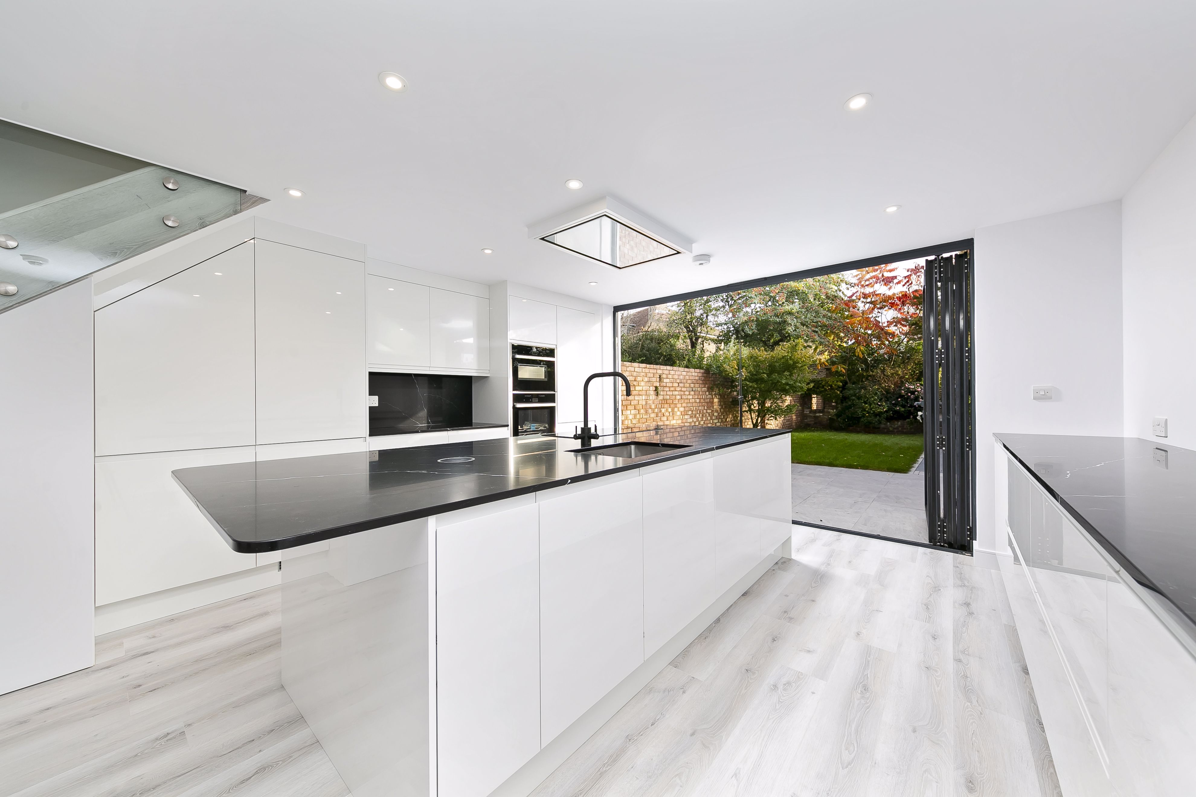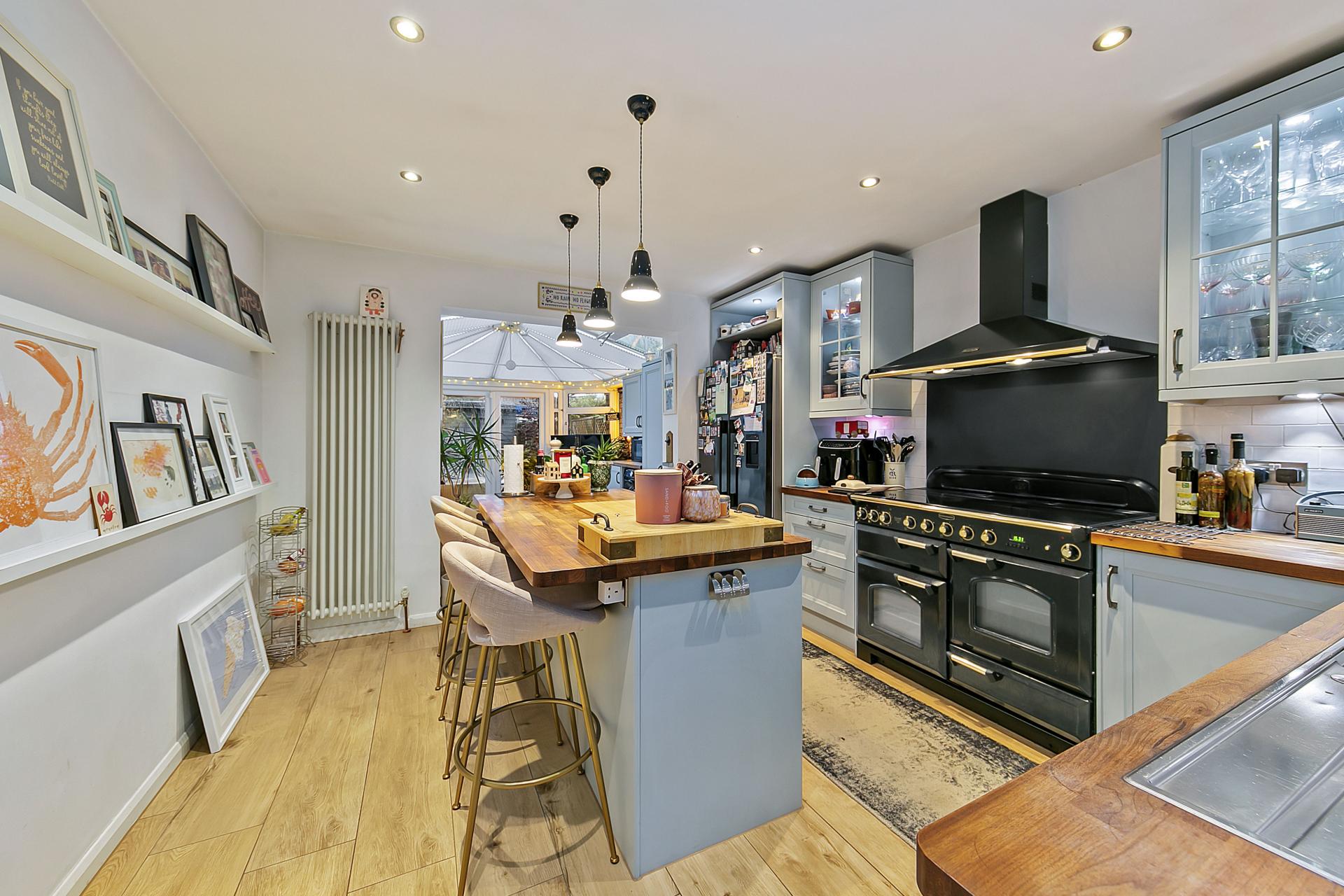 An inner lobby with further atrium skylight, leads down to the kitchen / breakfast / family room, passing immediately on your right to a beautifully appointed four-piece family bathroom with separate walk-in shower. At back of the house the kitchen flows naturally into family room / conservatory which, in turn, opens to the garden. A shaker style kitchen incorporates a breakfast island with inbuilt wine cooler, and provides excellent storage with under counter lights and backlit cupboards, all centred around a double range cooker.