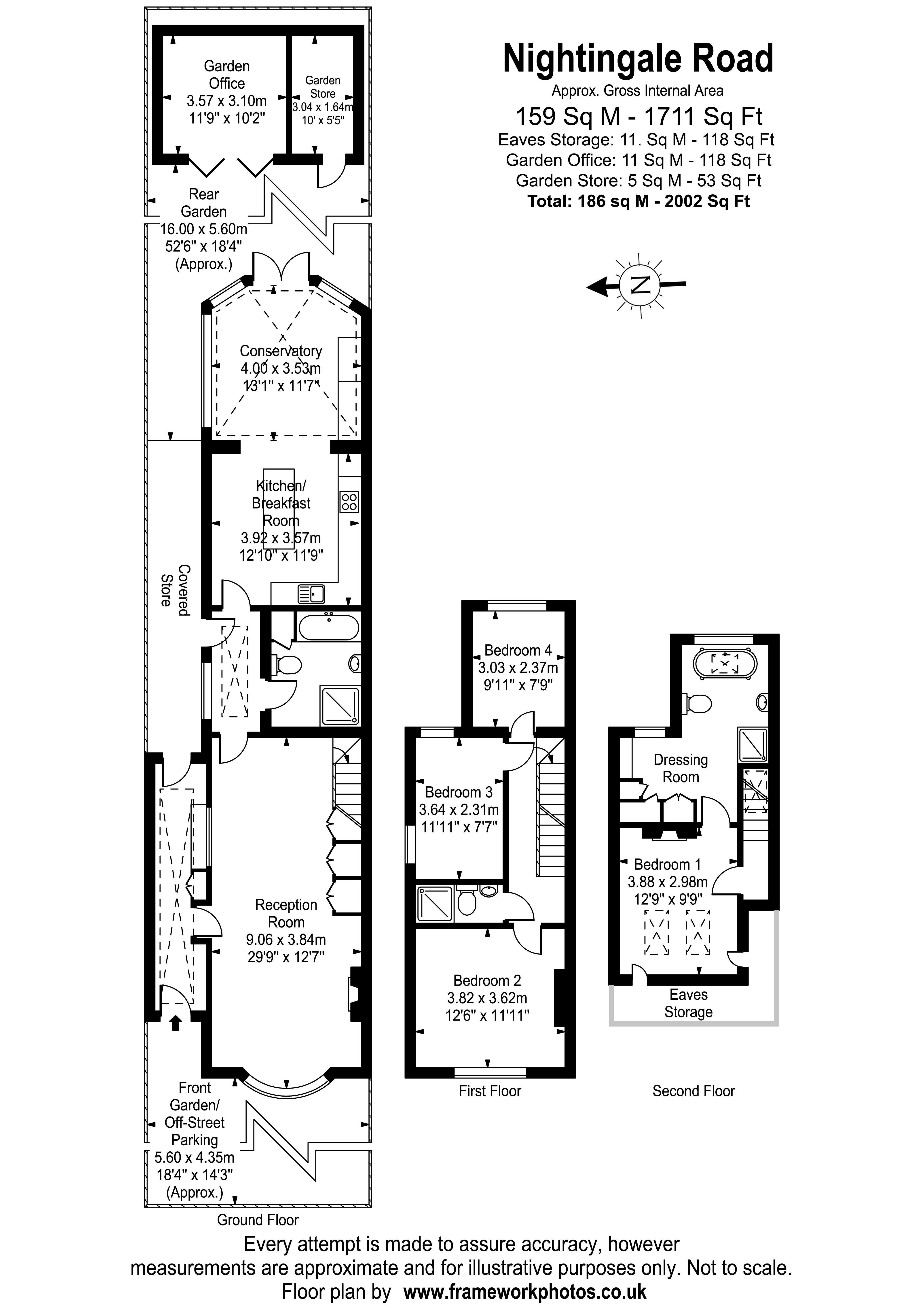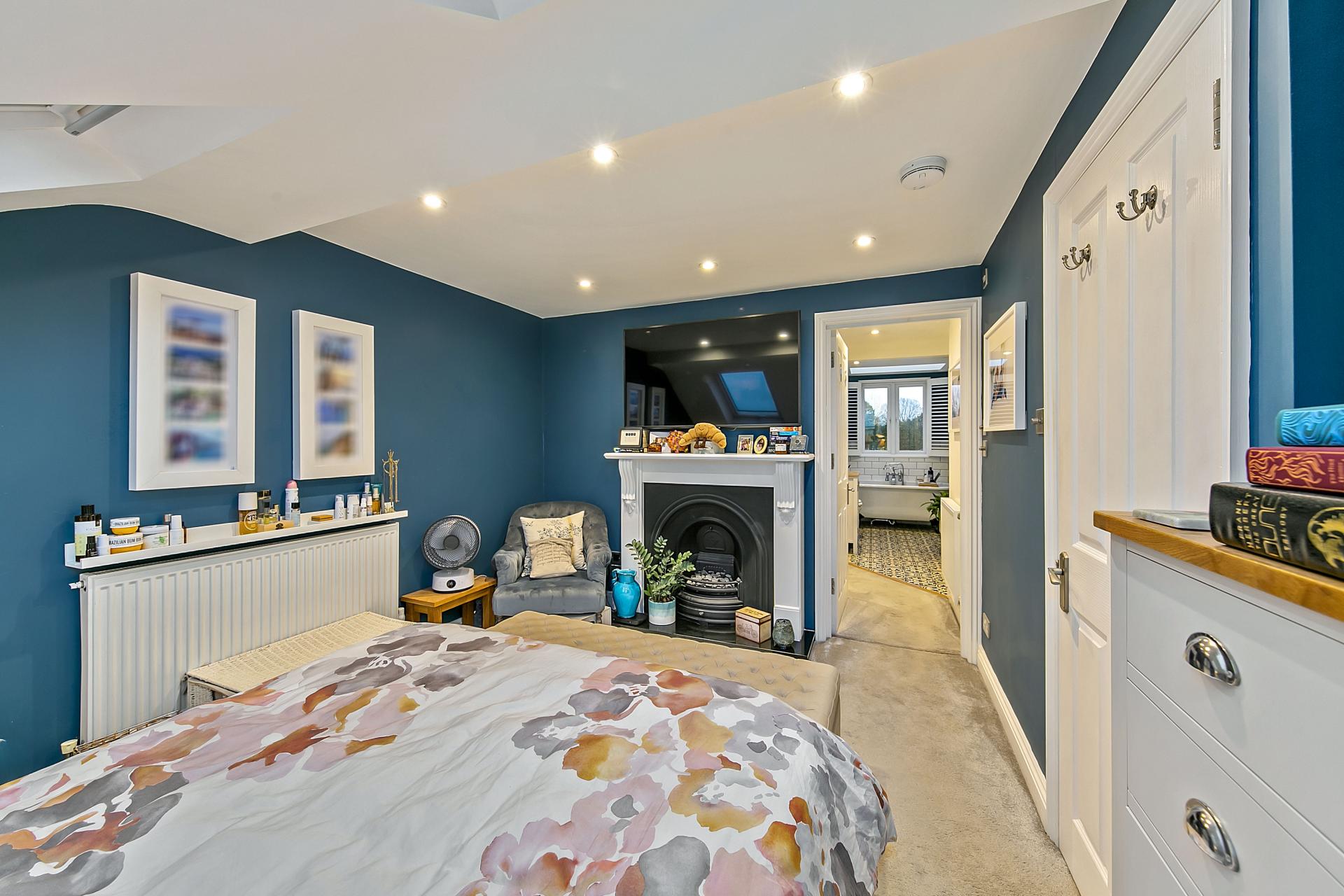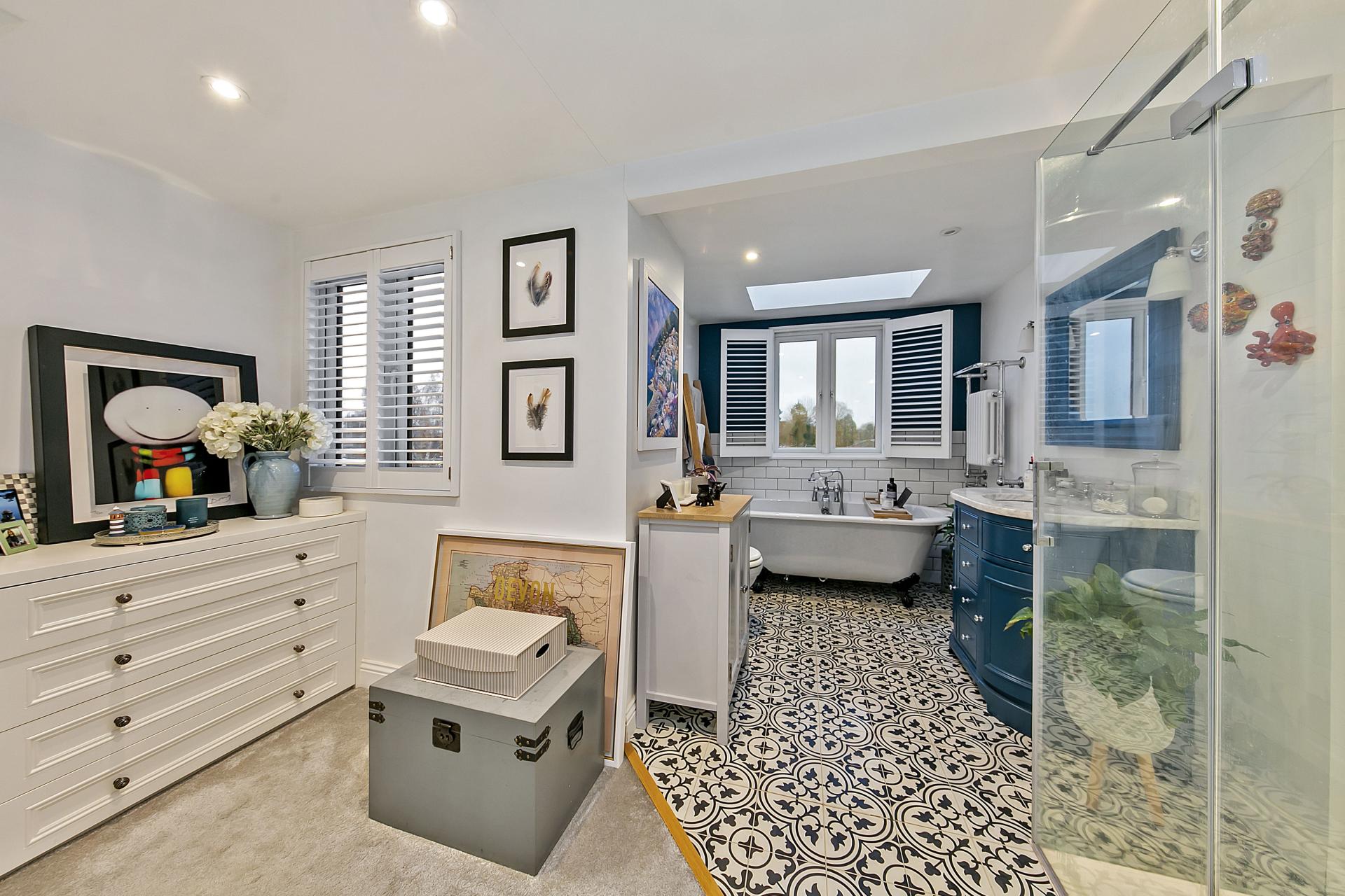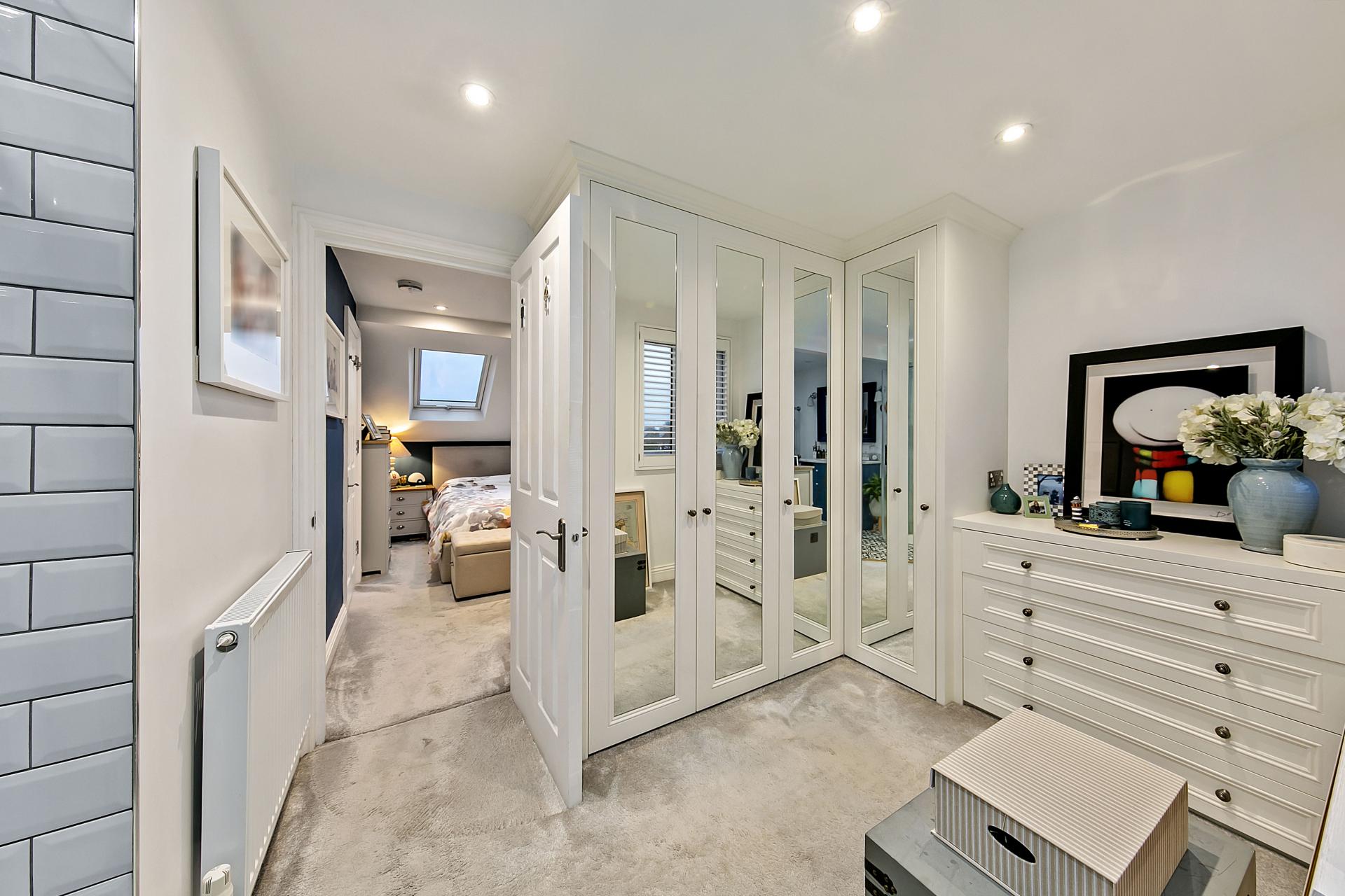 Upstairs at first floor level, you will find three good size bedrooms with use of a modern fitted shower room. From the landing a lovely balustraded staircase provides a natural continuation up to the top floor where a skylight window is located on the half landing for borrowed light. This floor reveals an impressive principle bedroom suite – what a lovely retreat at the end of a working day! The bedroom area features a charming ornamental fireplace, and opens up into a superb dressing area with fitted wardrobes, taking you through to a quality en suite bathroom designed to a Victorian style with freestanding roll top bath and separate shower.