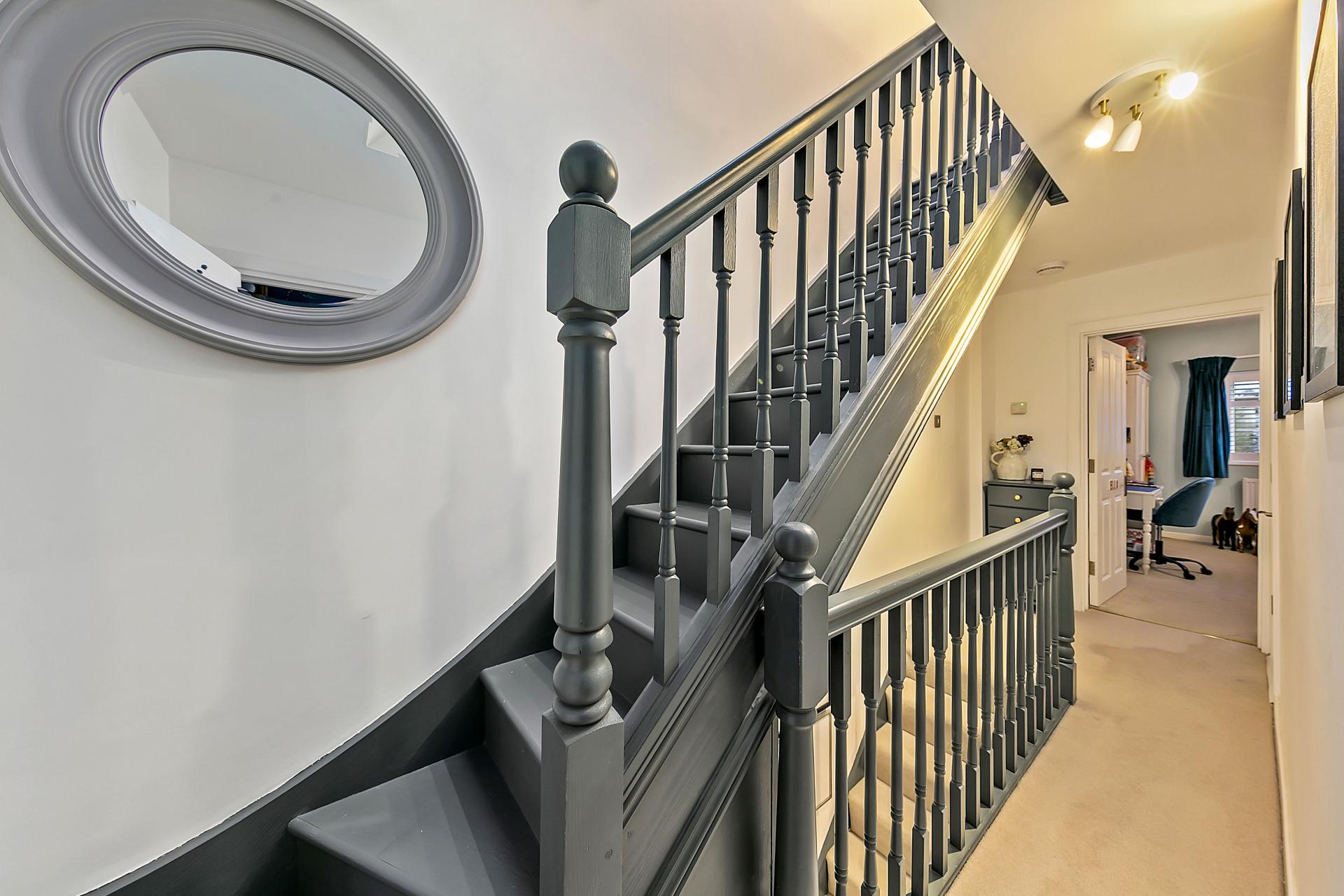 Outside, the gardens are landscaped with low maintenance in mind. The front has a gravelled driveway with designated bin store area and hardstanding for secure storage unit, whilst the enclosed rear garden is laid with easy-care lawn and sleeper borders. The garden studio is hard-wired for fast broadband connection.