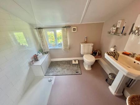 SHOWER ROOM 7' 10" x 9' 6" (2.41m x 2.90m) UPVC double glazed window to rear elevation, skimmed ceiling with centre light point, fitted storage cupboard housing hot water cylinder with slatted shelving, three piece suite comprising low level WC, pedestal wash hand basin with taps and tiled splashbacks, extractor fan, walk-in shower, heated towel rail.