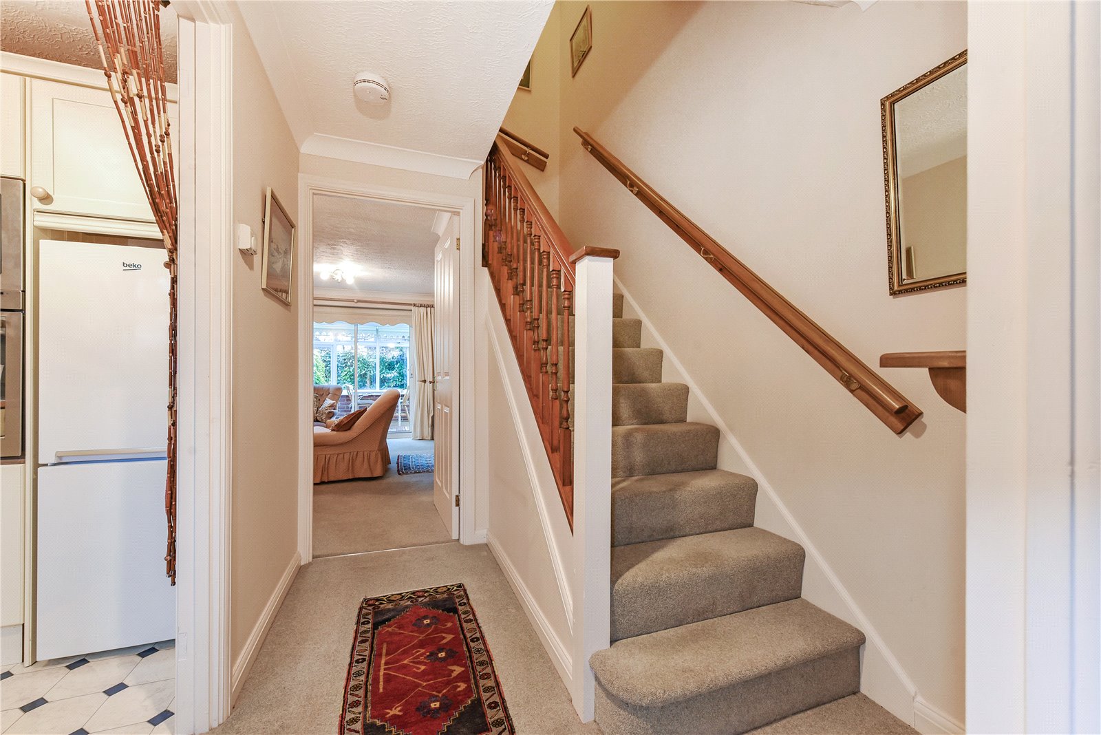 A covered entrance porch gives access to an entrance hall that takes you into the well proportioned sitting room. A conservatory offers flexibility and can be purposed as a dining space or garden room. The kitchen is comprehensively fitted, whilst a claokroom completes the ground floor accommodation.