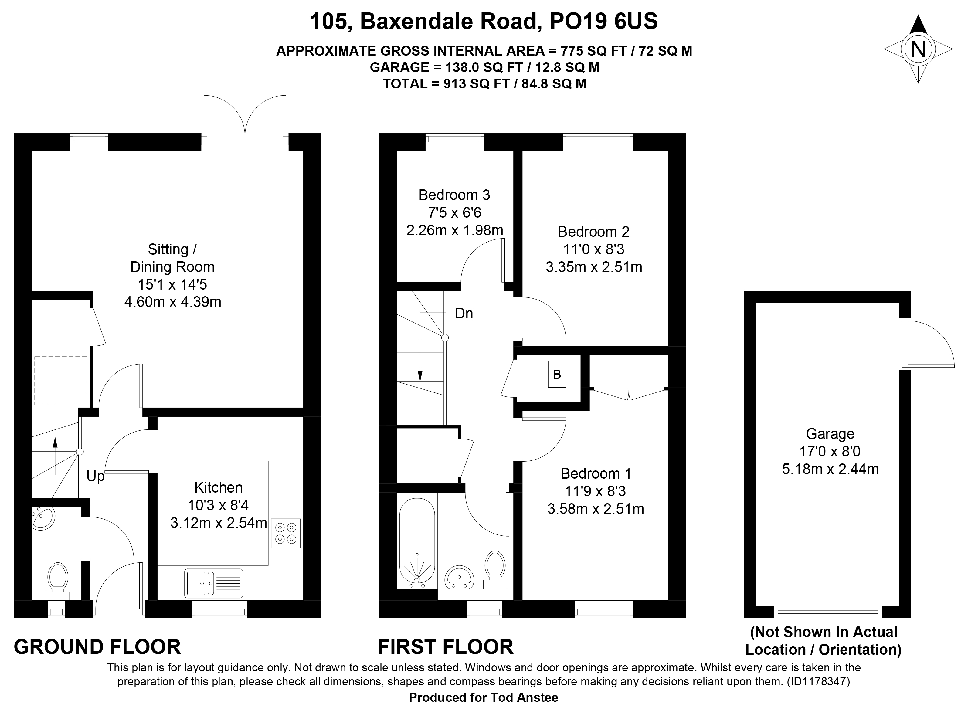 This bright and modern property is configured to provide a kitchen, sitting/dining room and a cloakroom to the ground floor. French doors open onto the rear garden from the sitting room. To the first floor, the landing gives way to the main bedroom (with useful built-in storage) and two further bedrooms. A family bathroom completes the living accomodation. Outside, the rear garden is fully enclosed and mainly laid to patio. The property enjoys the benefit of a separate garage, off street parking and a lovely south facing aspect across green space and pedestrian access to Swanfield Drive.