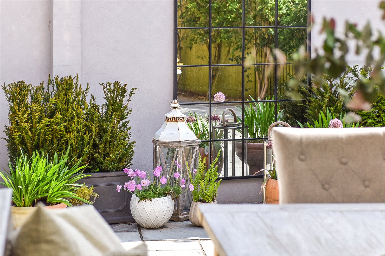 The rear garden is beautifully conceived, L-shaped and smartly paved with flagstones. There are shrub borders and a paved side access with secure gate. the whole is enclosed by panelled fencing.
