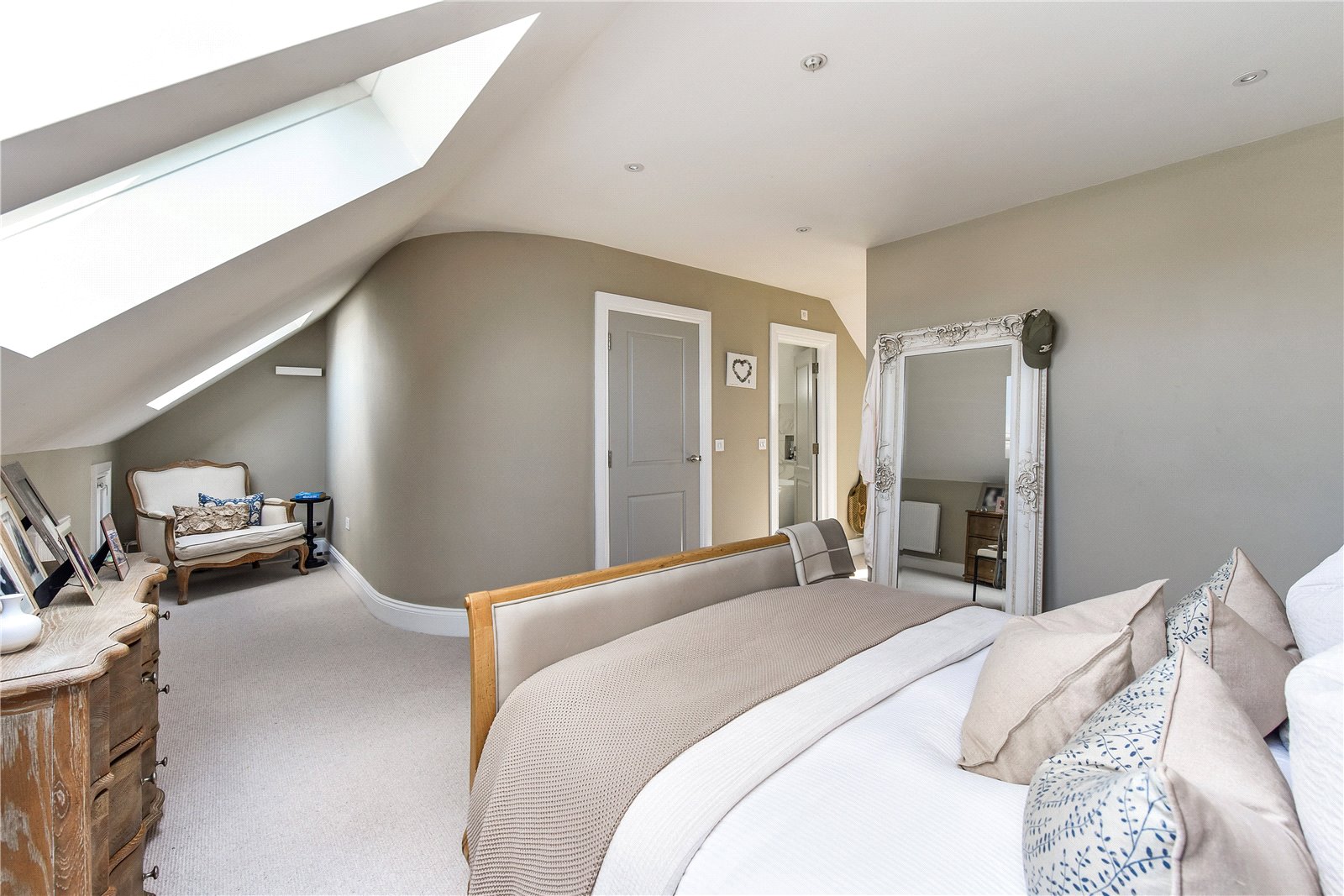 From the reception hall stairs rise to the first floor and here are to be found three double bedrooms each with an en suite and built in wardrobes. To the second floor and a landing gives way to the main bedroom suite. This superb room is well lit with a number of Velux style windows and enjoys the benefit of a dressing area with a bank of built in wardrobes and a superb four piece en suite.