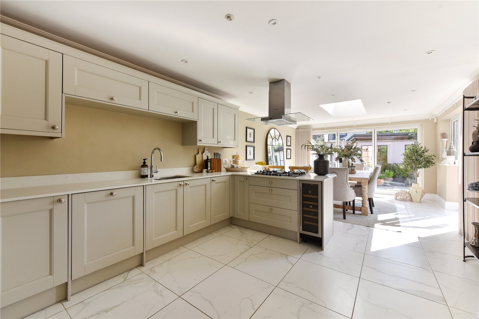 On entering, a reception hall guides you to the stunning kitchen/dining/family room. This exceptional space is flooded with natural light courtesy of a room lantern and a dual aspect. The kitchen is comprehensively fitted in a Shaker style with a range of integral Siemens appliances including a waist height oven with a combi oven above, five ring gas hob with contemporary extractor hood, a fridge freezer, wine fridge and dishwasher. The sink unit is fitted with a boiling Quooker tap and water softener, whilst the base kitchen units and breakfast peninsula are finished with quartz work tops. The substantial dining space connects to the garden via French doors and bi-fold doors respectively.
