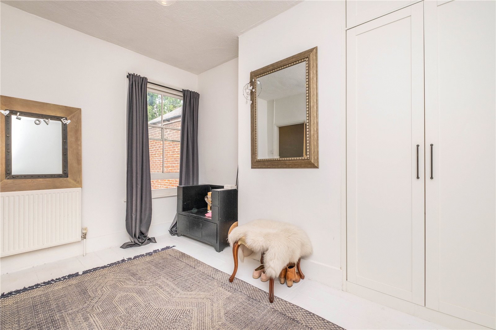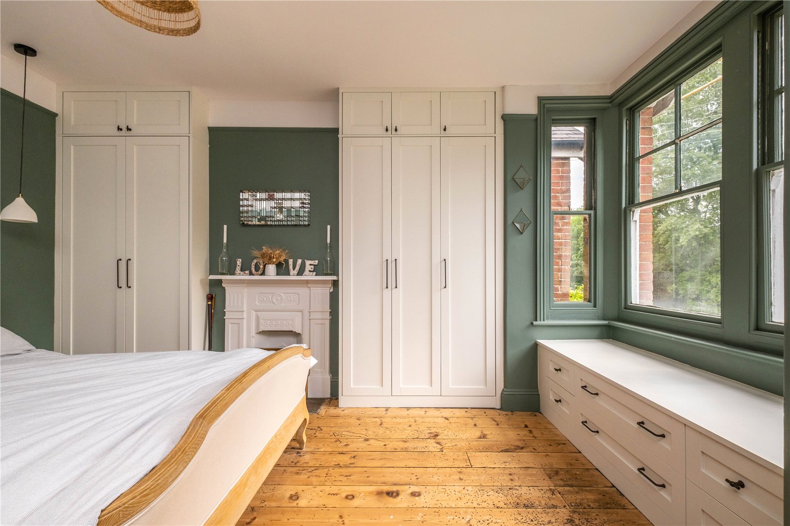 Bedroom 1 : Large striking main bedroom with deep bay and exposed wood flooring. Ornate fireplace (feature), built-in triple and double wardrobes, light point and radiator.